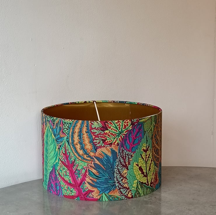 Drum Lampshade covered in glorious Hot Autumn Leaves fabric.
