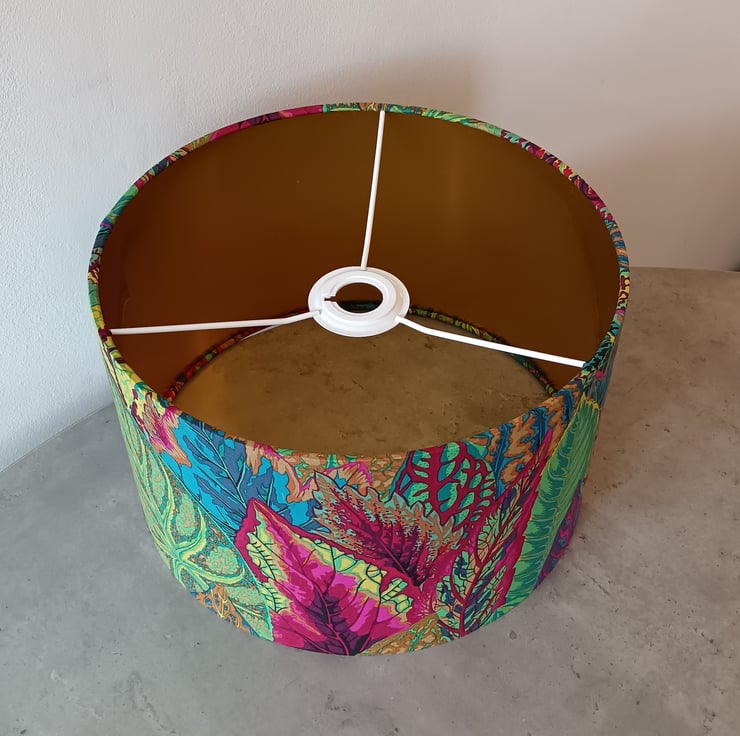 This lampshade has a gold lining which gives a wonderful golden glow when lit up.