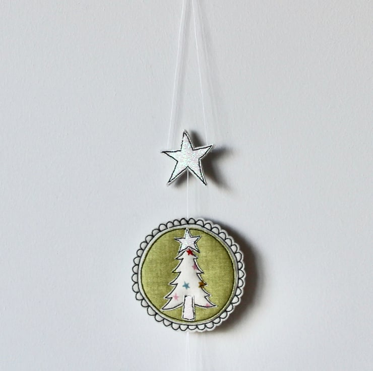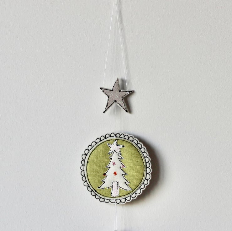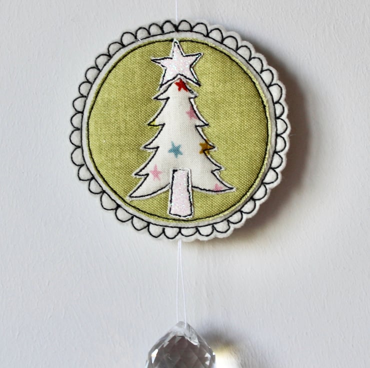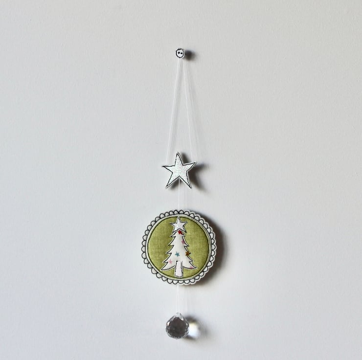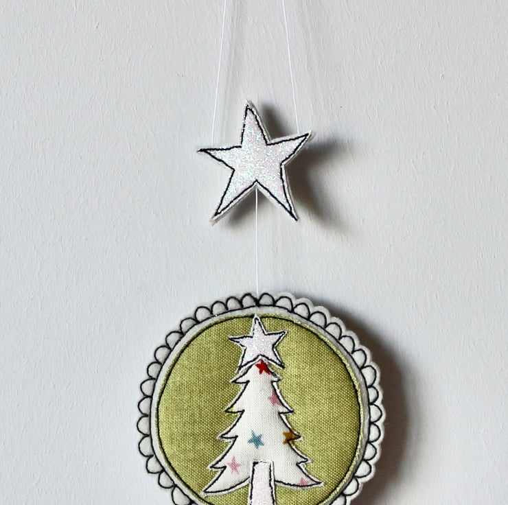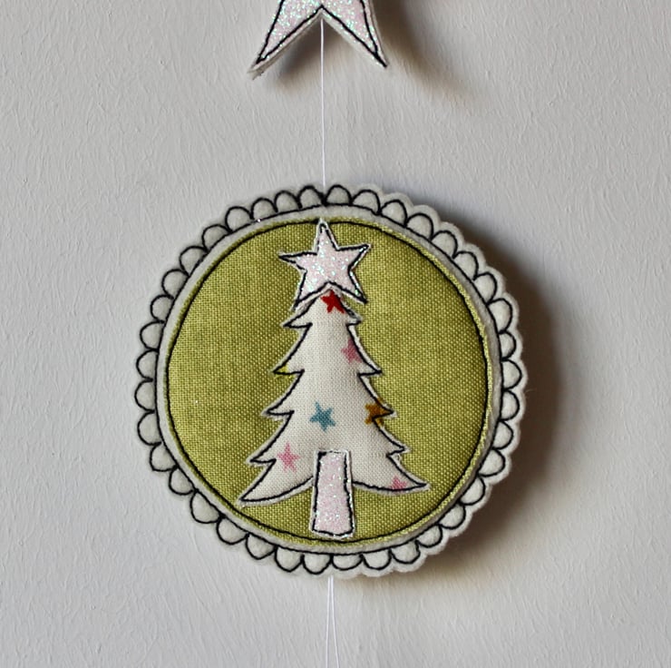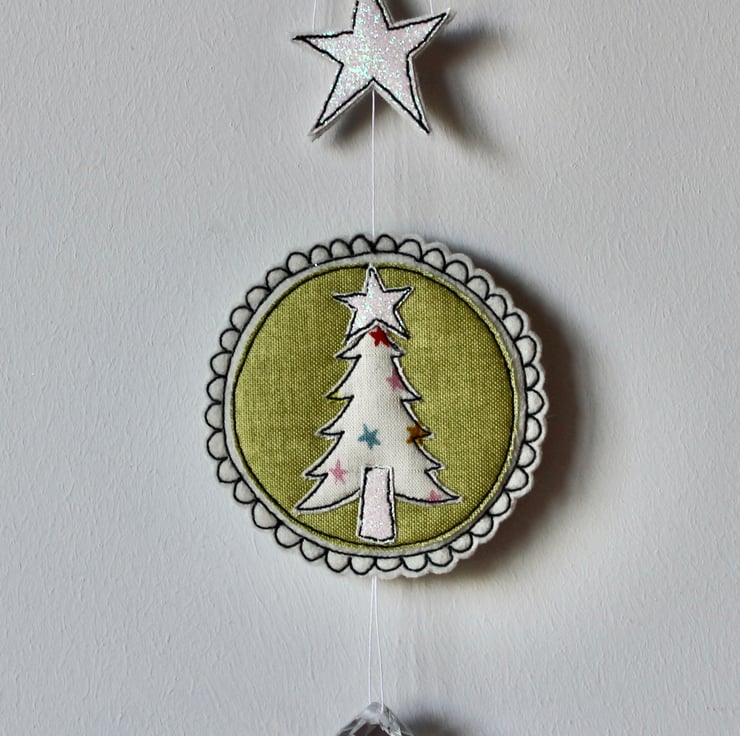 A delightful hanging decoration which is created using multiple layers of 100% wool felt, cotton cloth, glitter fabric and free hand machine embroidery. It is cut out by hand using a very sharp pair of scissors.