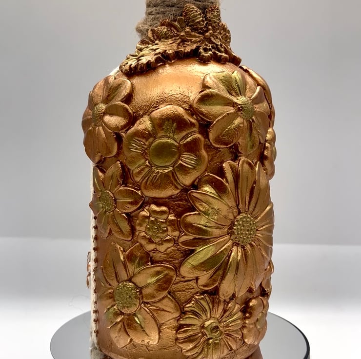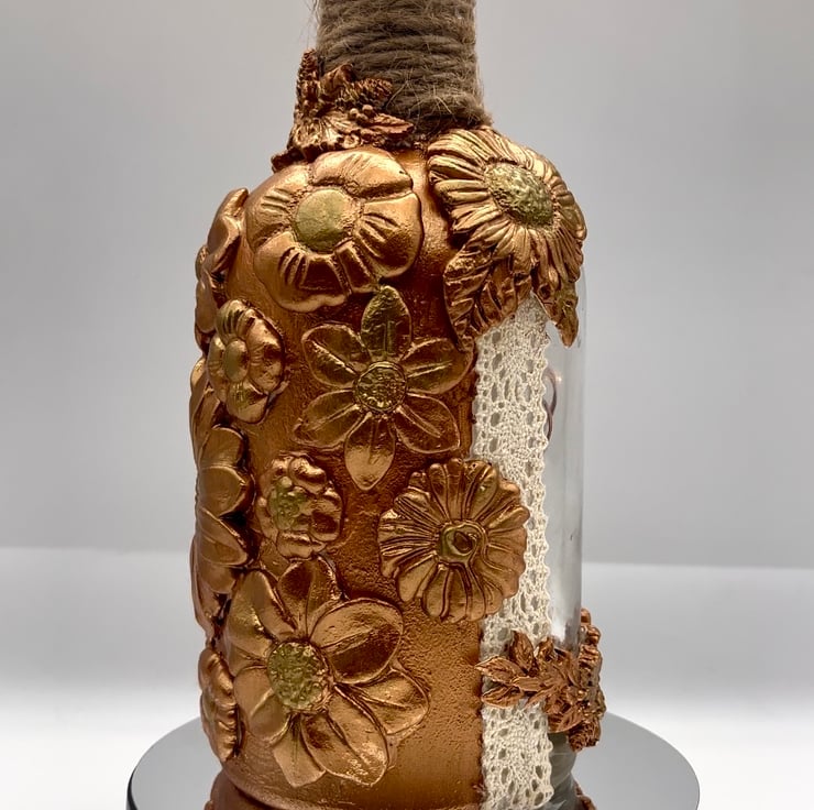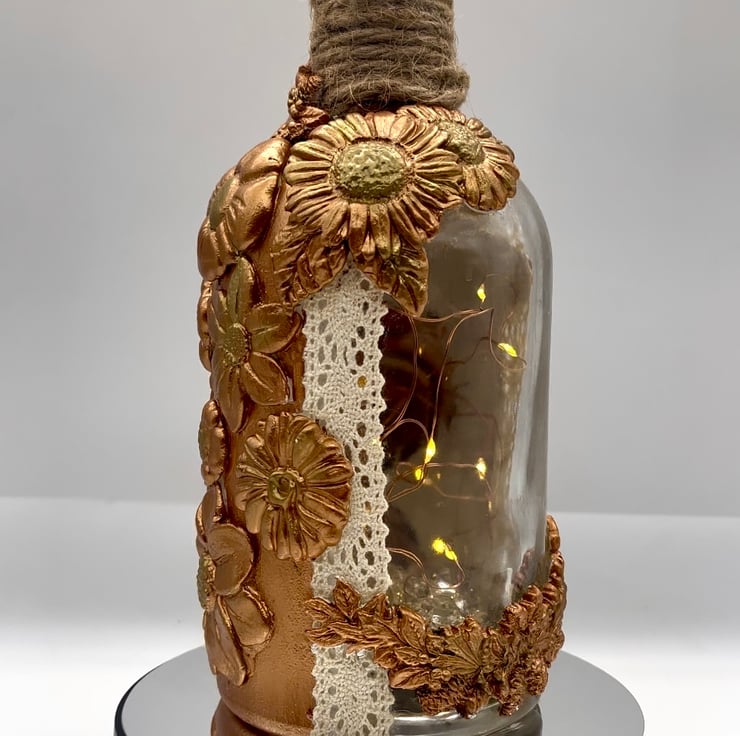 Bottle has battery operated cork string lights. Outside of the bottle has been decorated with pretty clay flowers which have been handmade and painted in a copper colour with gold highlights . Neck of bottle has been finished with gold leaf and jute rope.