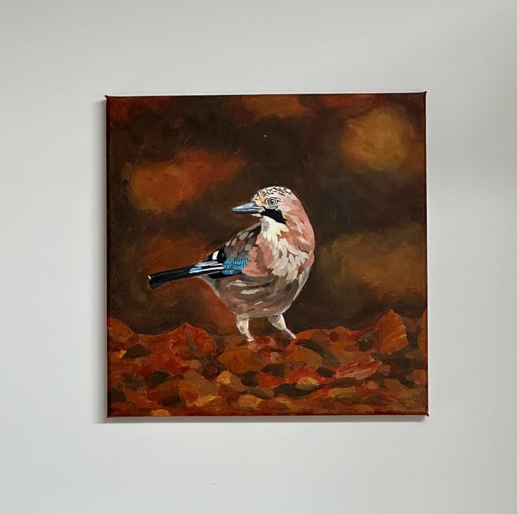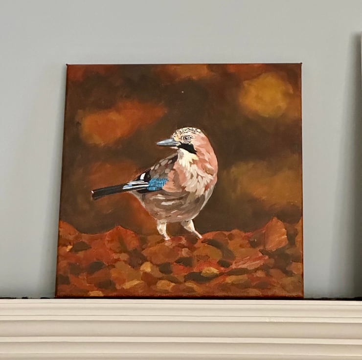 I’m a big bird lover, I’m particularly interested in birds that are full of mystery and intelligence. The crow family have this in abundance! The jay is very handsome with his blue eyes and flash of blue feathers in his wings. I felt he would fit perfectly into an autumnal scene of a forest with leaves all around his feet.