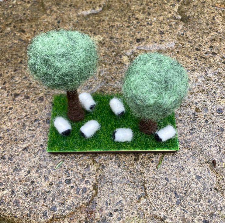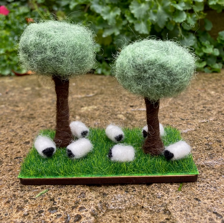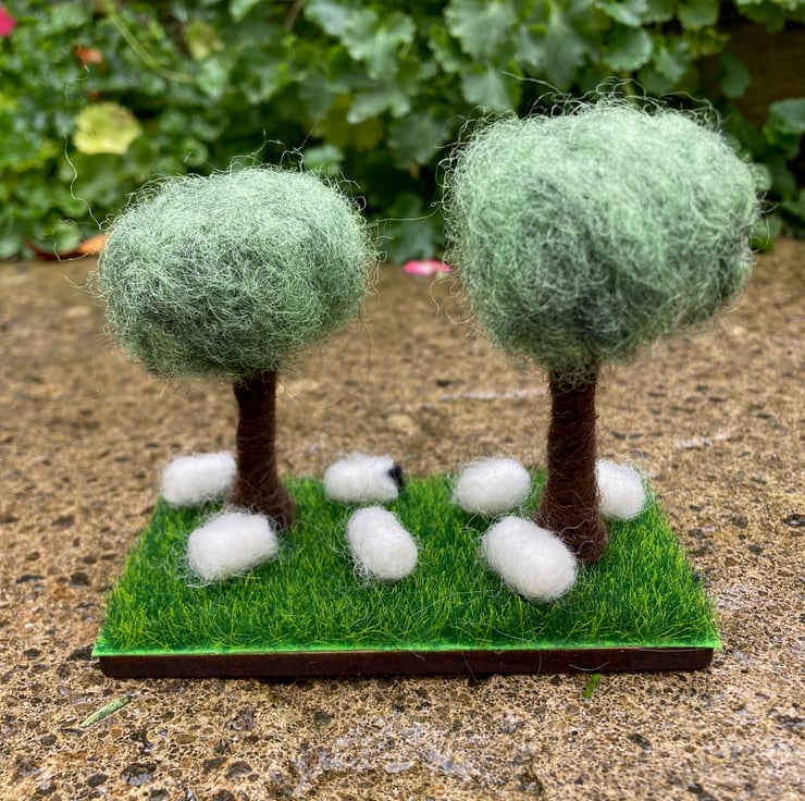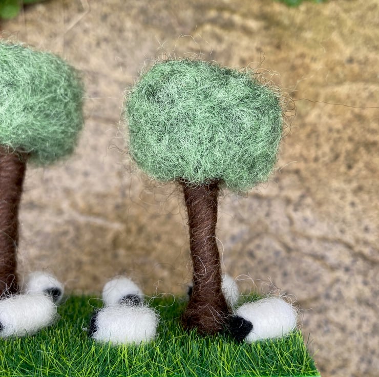 A sweet little miniature 3d needle felted ornament of black faced sheep grazing beneath the trees. Two trees and seven miniature sheep have been needle felted using woollen fibres and a barbed felting needle. These have then been mounted on a small (8cm x 5cm) wooden plaque covered in artificial grass material. The ornament stands approximately 7cm tall with each sheep measuring approximately 1cm long.