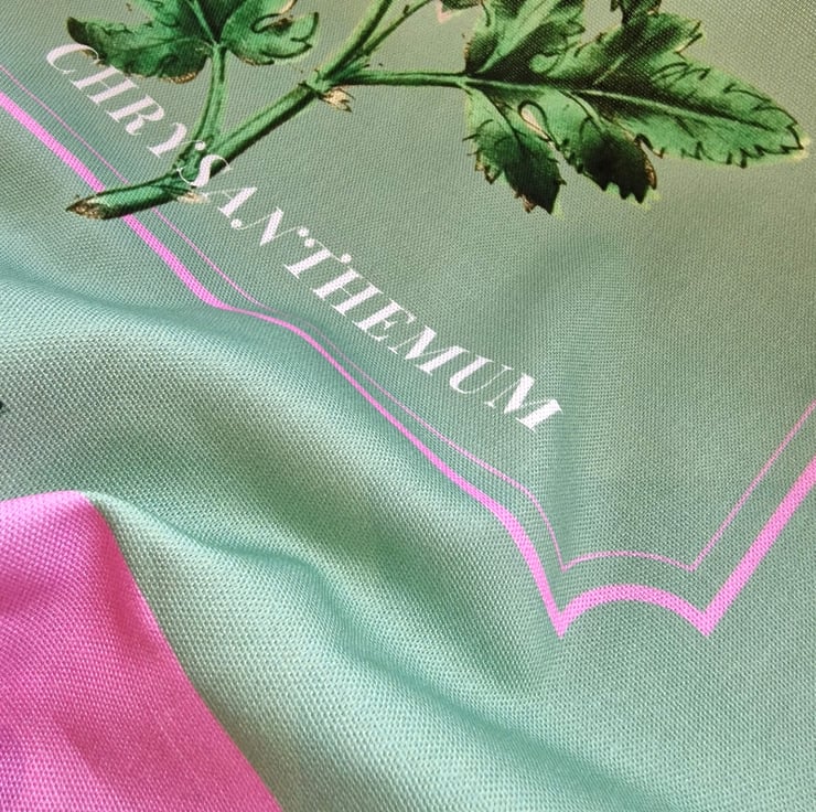 Vintage botanical drawing of an Indian Chrysanthemum set against a pastel green background and bordered in pink.