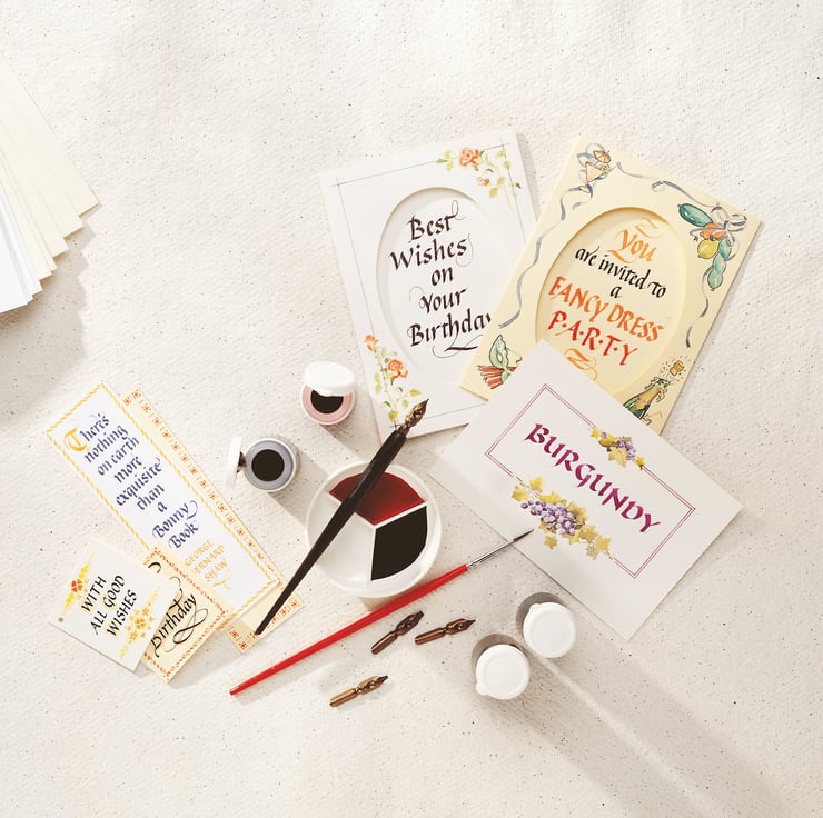 Your Kit contains: Nib Holder, Nibs (sizes 1, 2, 3.5, & 5), Reservoir, Calligraphy Inks in Blue, Black, Red & Yellow, Artist's Brush, Mixing Palette, Calligraphy Pad, Greeting Cards, Envelopes, Gift Tags and Bookmarks.