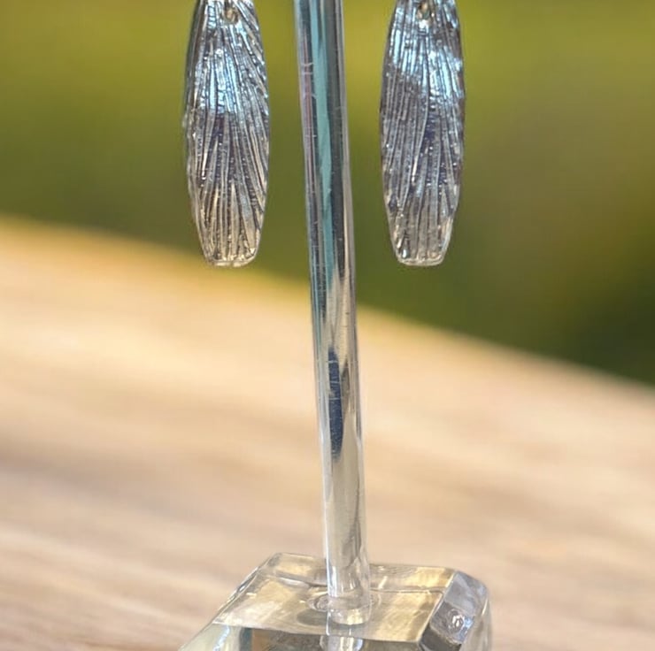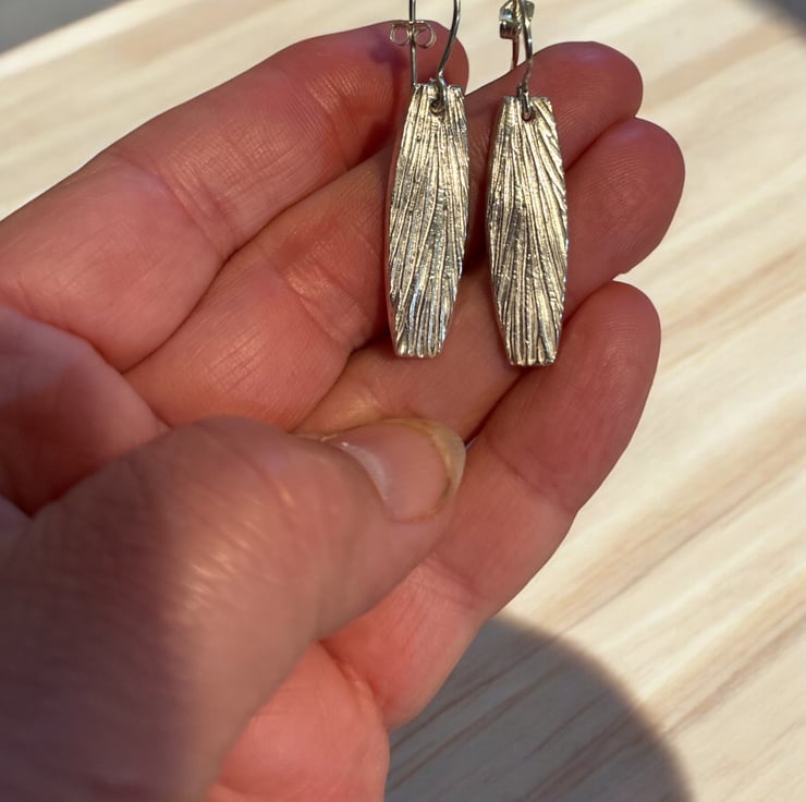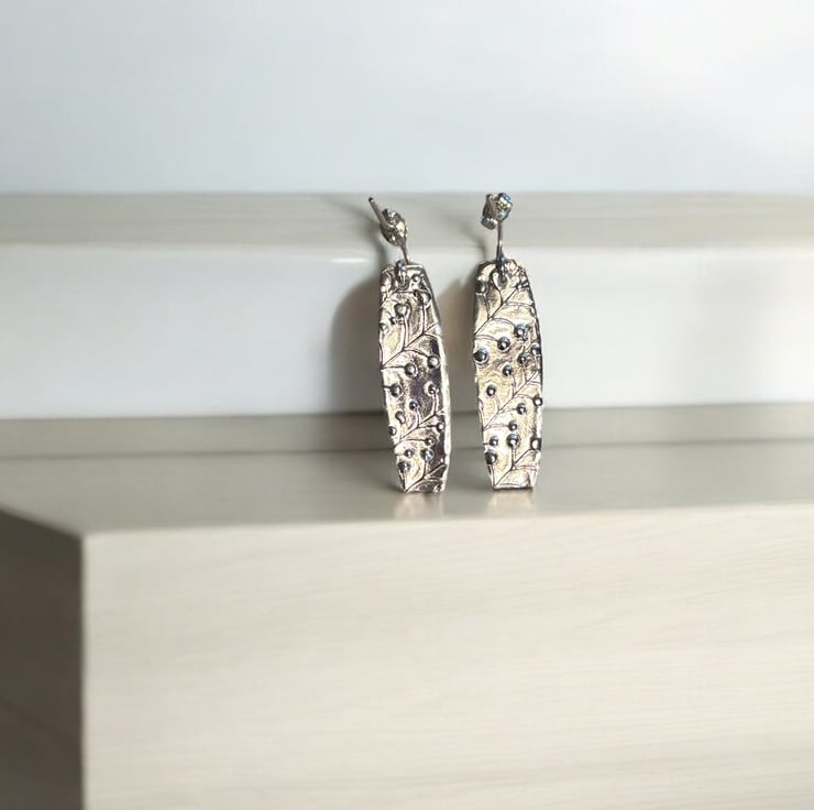 They are a really lovely shape, that hangs well, heavily textured on the front with an abstract lined pattern which picks up the light beautifully. The back is also textured with a pretty abstract plant pattern, I like to texture both sides of my work, if you have short hair, or are wearing your hair up, if the reverse of the earring can be seen from behind, it is just a beautiful as the front (the 4th picture shows the reverse of the earrings)