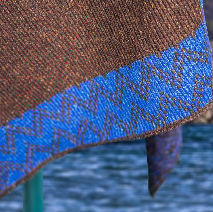Knitted with a fine merino, silk and nylon yarn with a fairisle wave design edging.