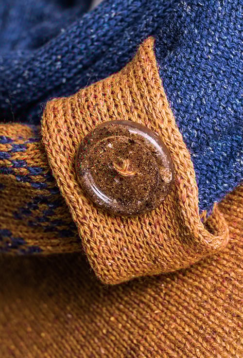 Knitted with a fine merino, silk and nylon yarn with a fairisle wave design and finished with one of my handcrafted buttons filled with sand.