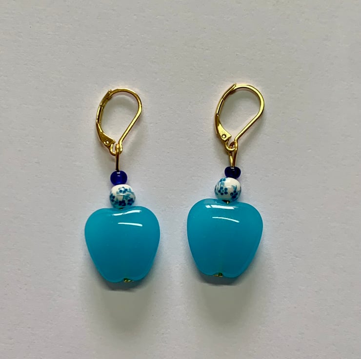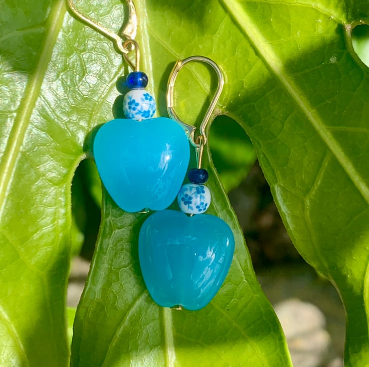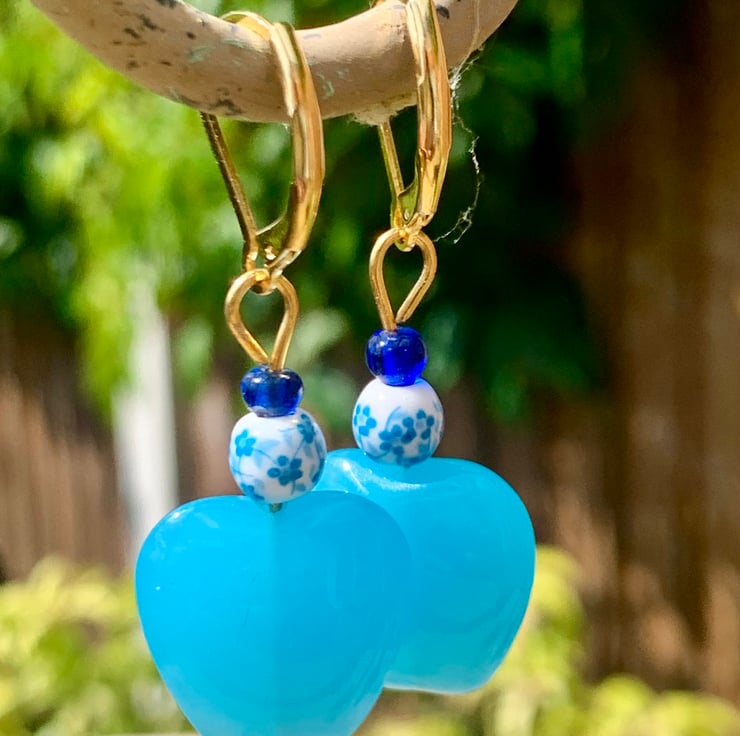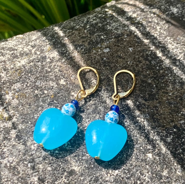 Love how these Blue tones look together. For this pair of drop earrings I've used a beautiful pale blue glass heart that sits perfectly with the small white porcelain bead decorated with a delicate blue floral design. They are topped off with a deep blue glass bead. Hung on a Gold Plated lever back ear fitting.