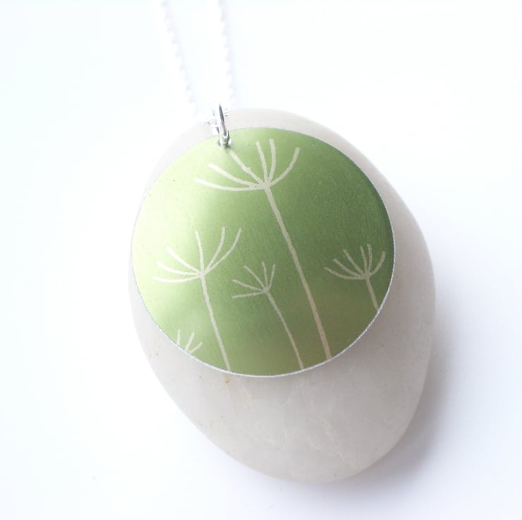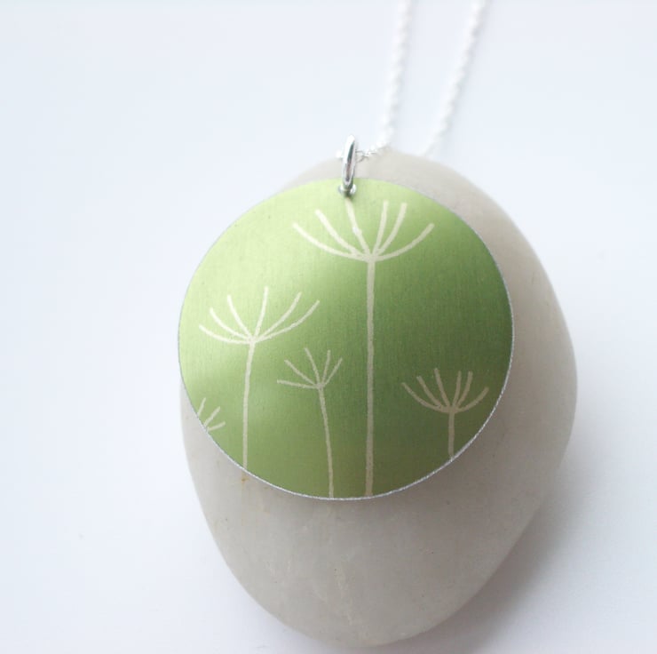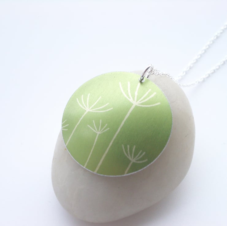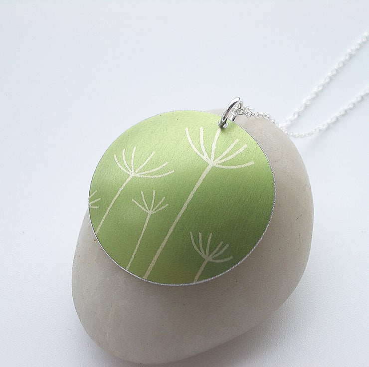 This green coloured pendant is hand made from aluminium which I have dyed and printed with a delicate dandelion seed design before sealing the colour in to the aluminium. I cut out the disc shape by hand and file the edges to reveal the bright silver aluminium underneath. Finally I dome the metal slightly so that it catches the light.