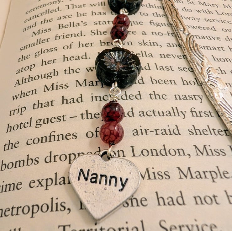 Show your Nanny some love with this beaded bookmark, featuring a pair of deepest purple glass flowers and a selection of dark pink agate beads. Beneath them hangs a heart shaped charm bearing the word Nanny. The main body of the bookmark has a celestial theme.