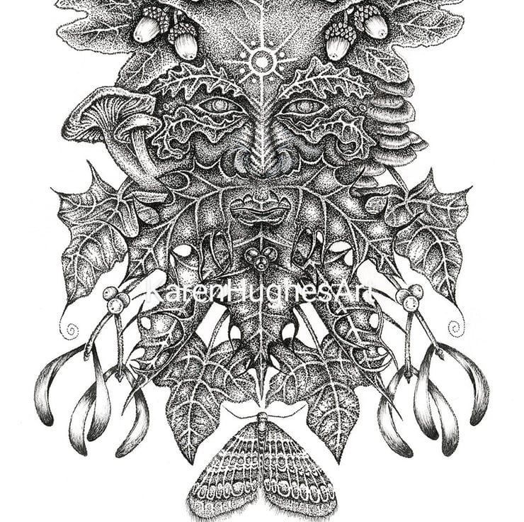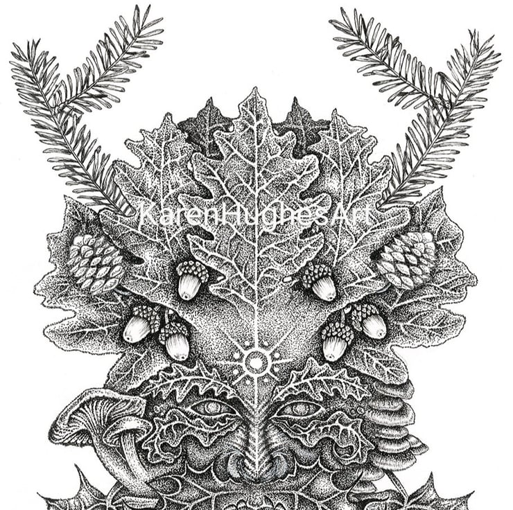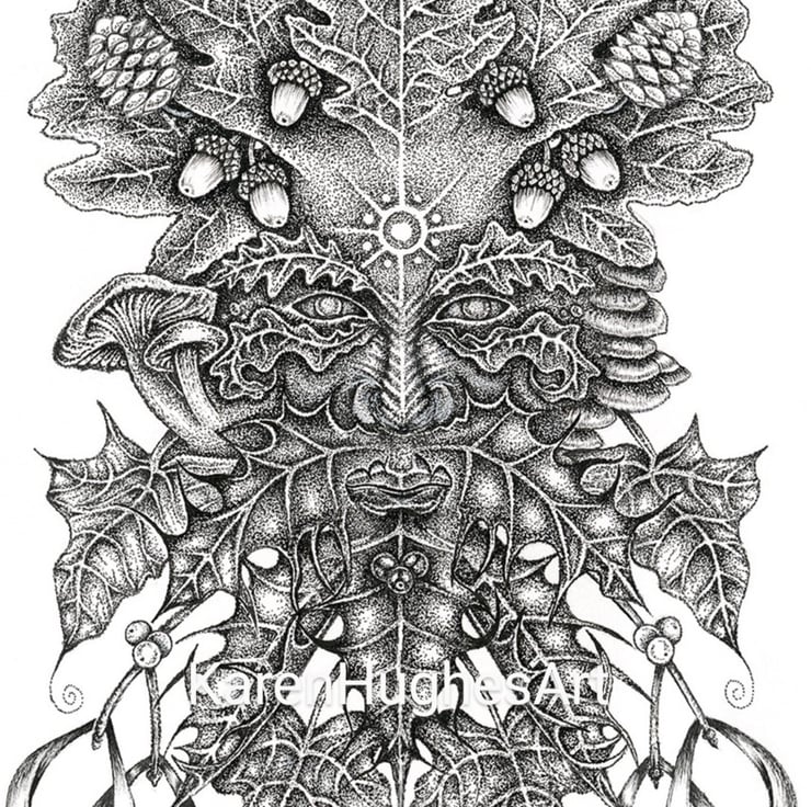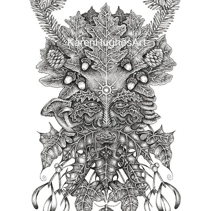 Lord of the Winter Forest is part of my Earth series of drawings. I am very taken with the legends of the Green Man, protector of nature, and this is my depiction of him in his autumn/winter aspect.