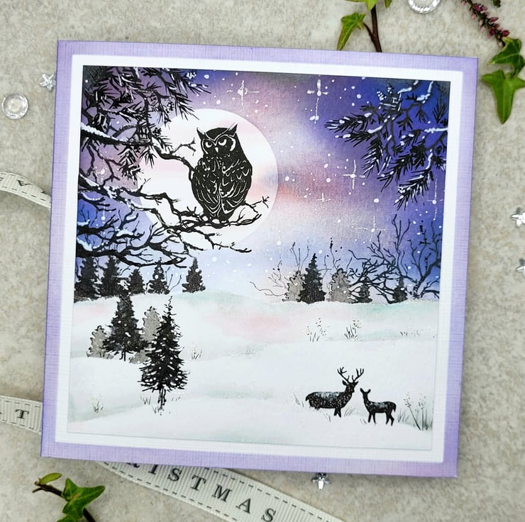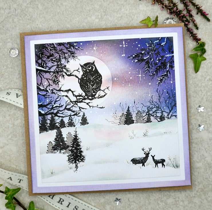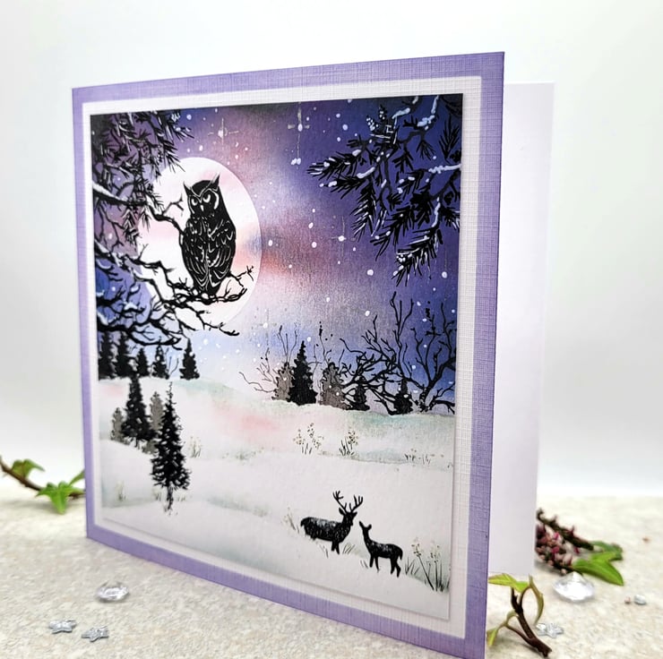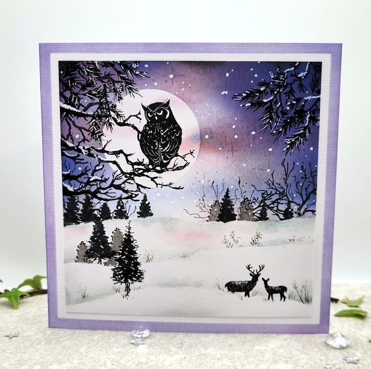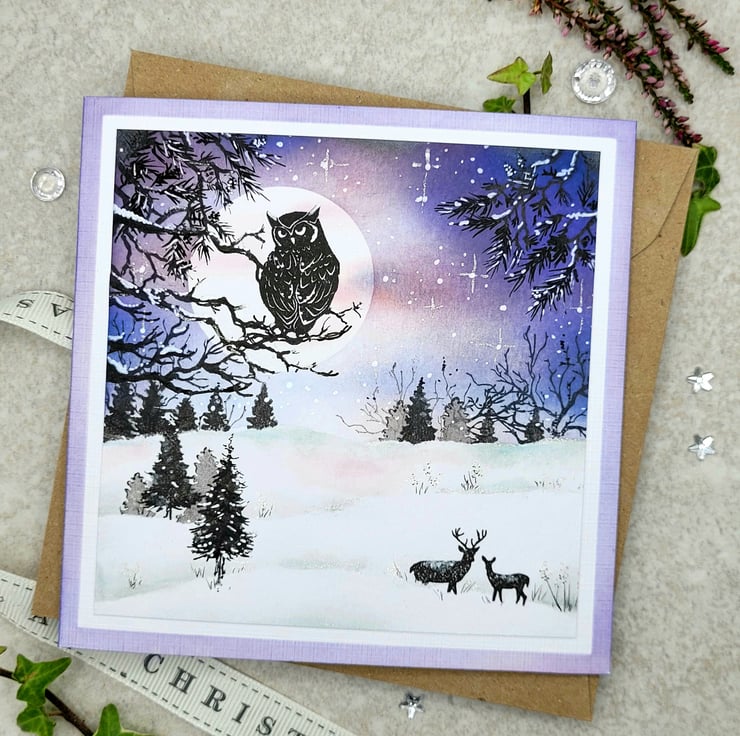 A beautiful blank card for Christmas, a birthday or other occasions. This detailed, one-of-a-kind card measures 12.5 x 12.5 cms and has been designed and individually made by hand in my craftroom. I used Card-i-o stamps to create the owl, deer and the trees, with archival black ink. I then built the winter scene around them with inks, brushes and pens. There is a luminous moon and a dark starry night sky. Other small hand-drawn details have been added with black and white fineliner pens.
