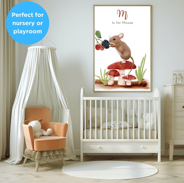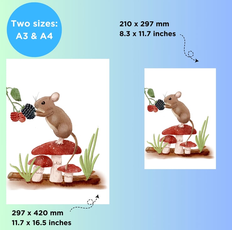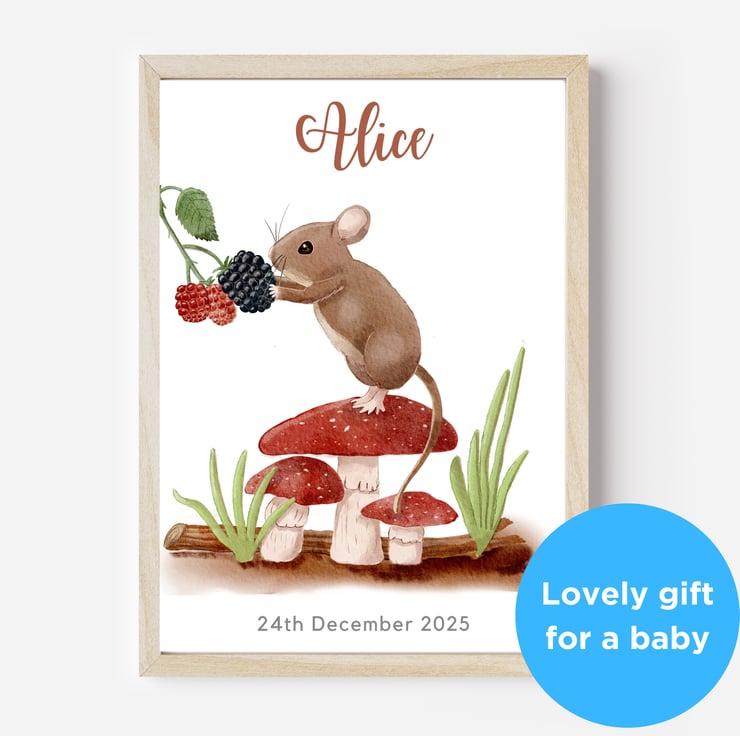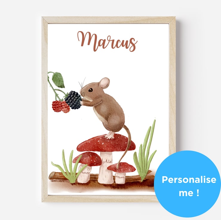 Looking for a cute piece of animal artwork for your child's nursery, bedroom or playroom that is modern and not overly twee? This adorable print of a mouse harvesting autumn blackberries will take your child on a magical forest adventure. The perfect finishing touch if you have chosen a woodland theme for their room.