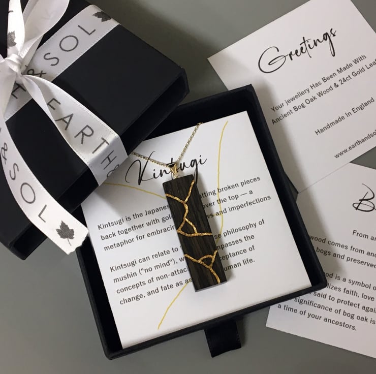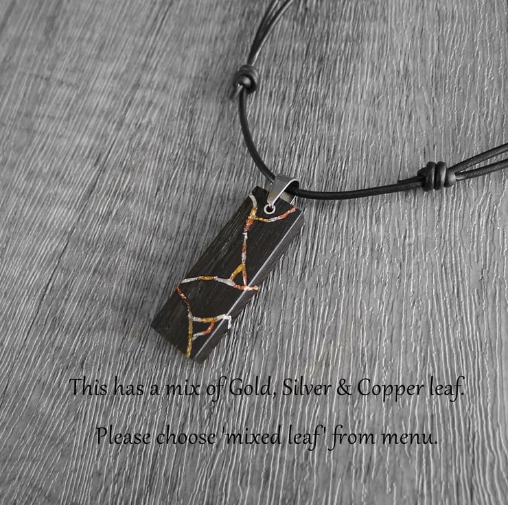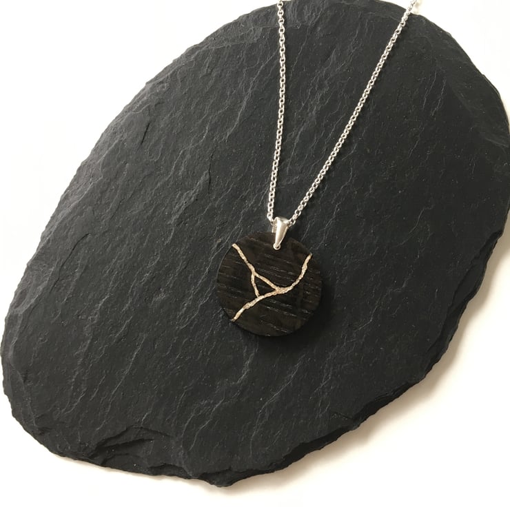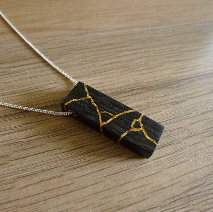 Kintsugi necklace made from Ancient bog oak wood, inlaid with 22ct gold leaf. You can also choose a custom made necklace with rose gold, fine silver, copper leaf or gemstone inlay.