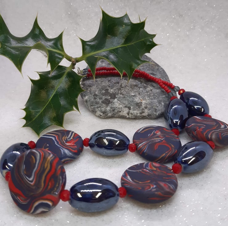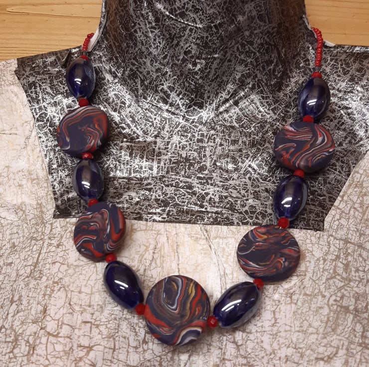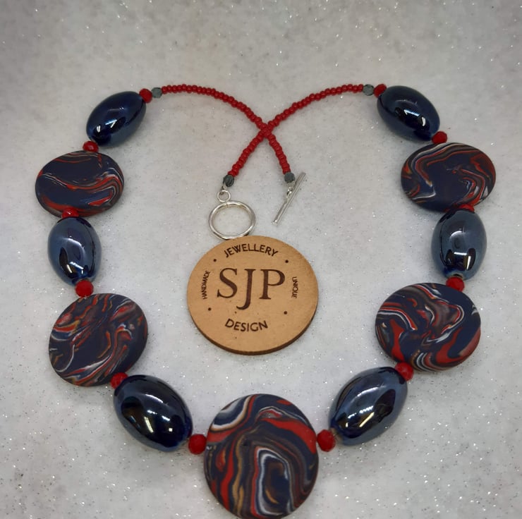 A distinctive disc shaped necklace featuring red, navy, gold and white polymer clay disc beads in a unique swirl design with a hint of sparkle.