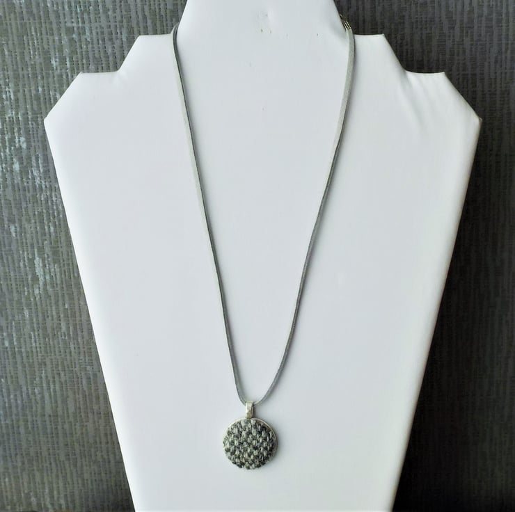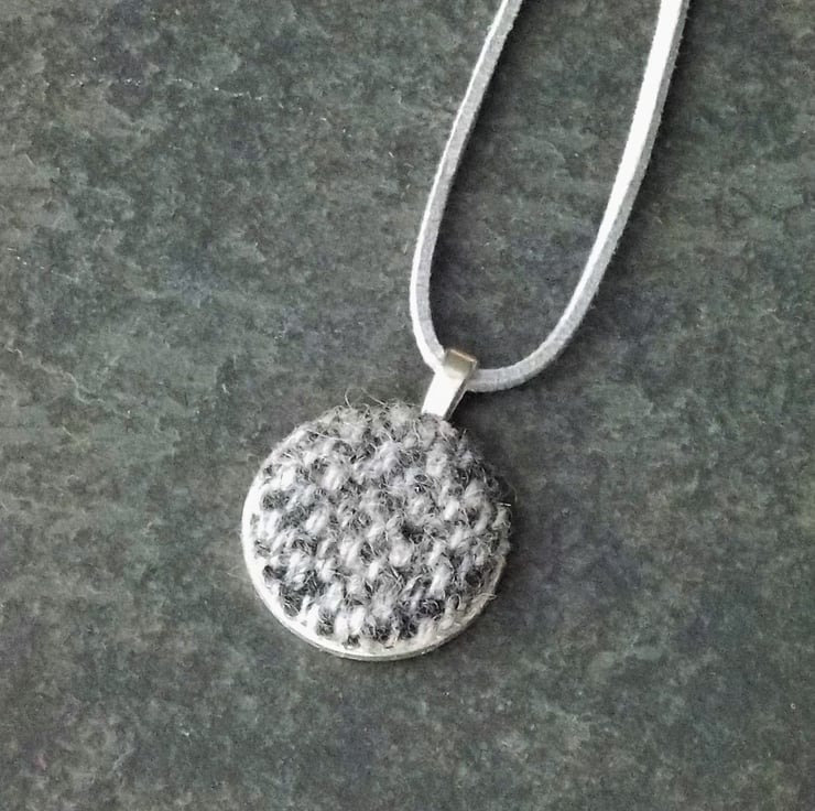 Here's an unusual pendant necklace; it is handmade from a mottled grey design of Harris tweed fabric. I have shaped and mounted the Harris tweed onto a circular silver coloured metal pendant, 2.5cm across. This pendant is then strung onto a grey faux suede cord made with wool. The cord is 44cm (18") long, with a 5cm (2") extension chain.