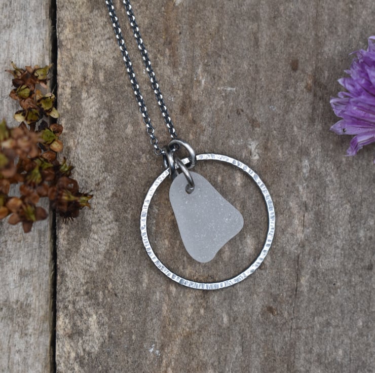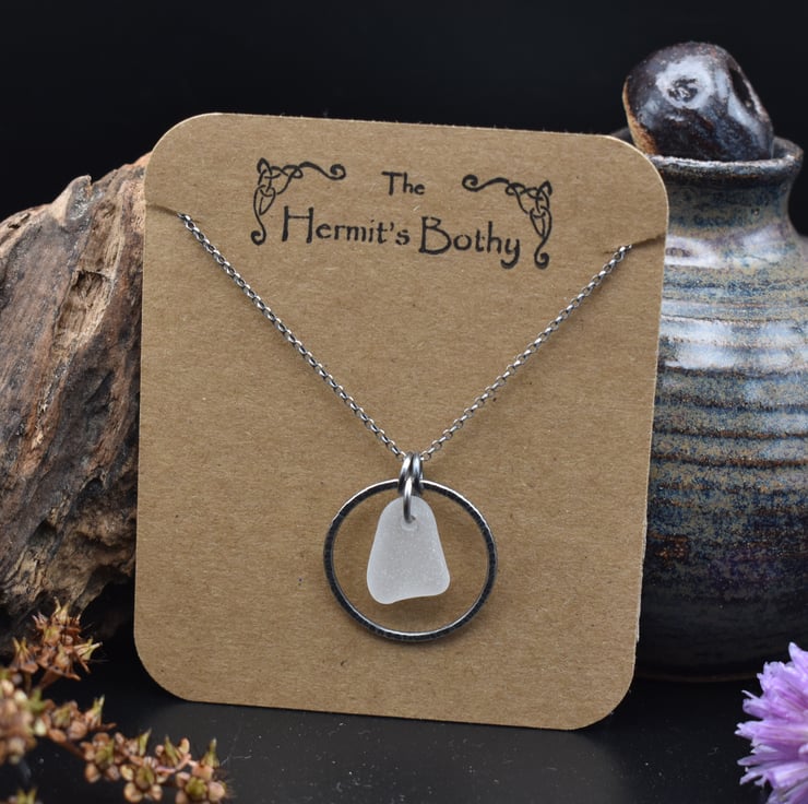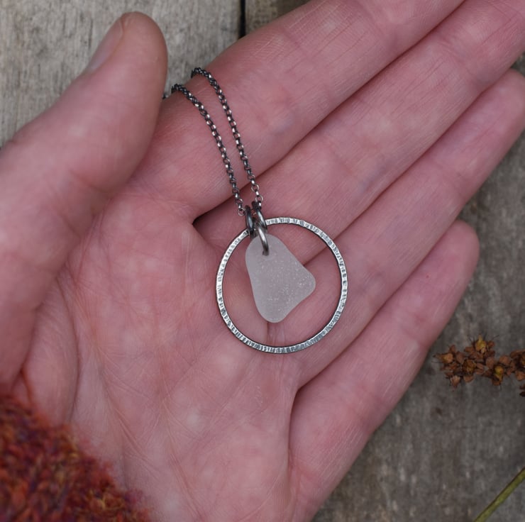 This necklace has been made using recycled sterling silver, and sea glass collected locally in the Scottish Highlands. It features a lovely rounded piece of frosted white sea glass suspended in a handmade sterling silver 925 hoop, which has been hammered for texture. All the sterling silver components have been oxidised using liver of sulphur to give an antiqued finish. The pendant comes with a sterling silver belcher chain with a bolt ring clasp, in a length of either 45cm (18 inches) or 50cm (20 inches) - please specify when ordering which chain length you would prefer (please refer to length reference photo).