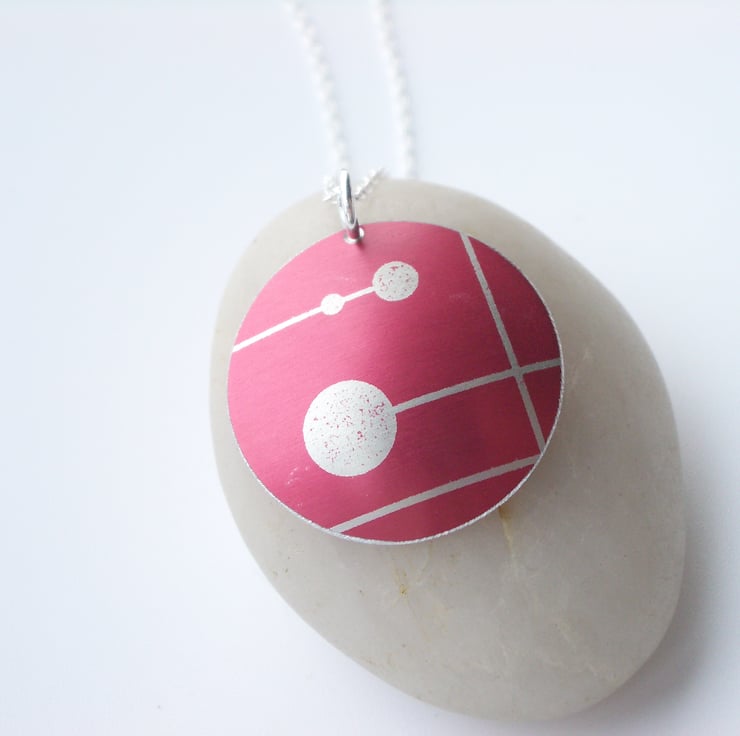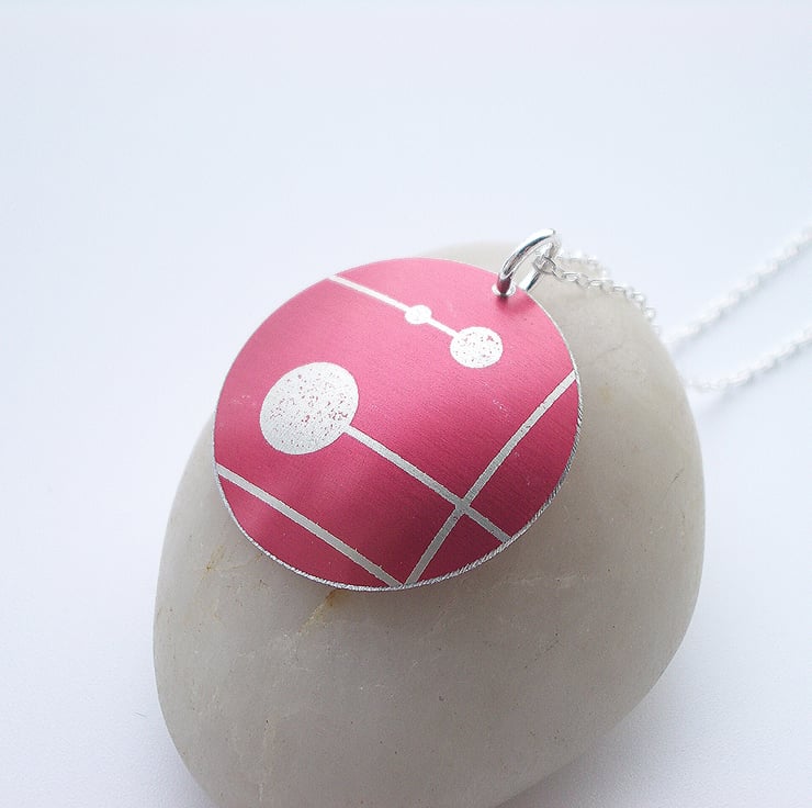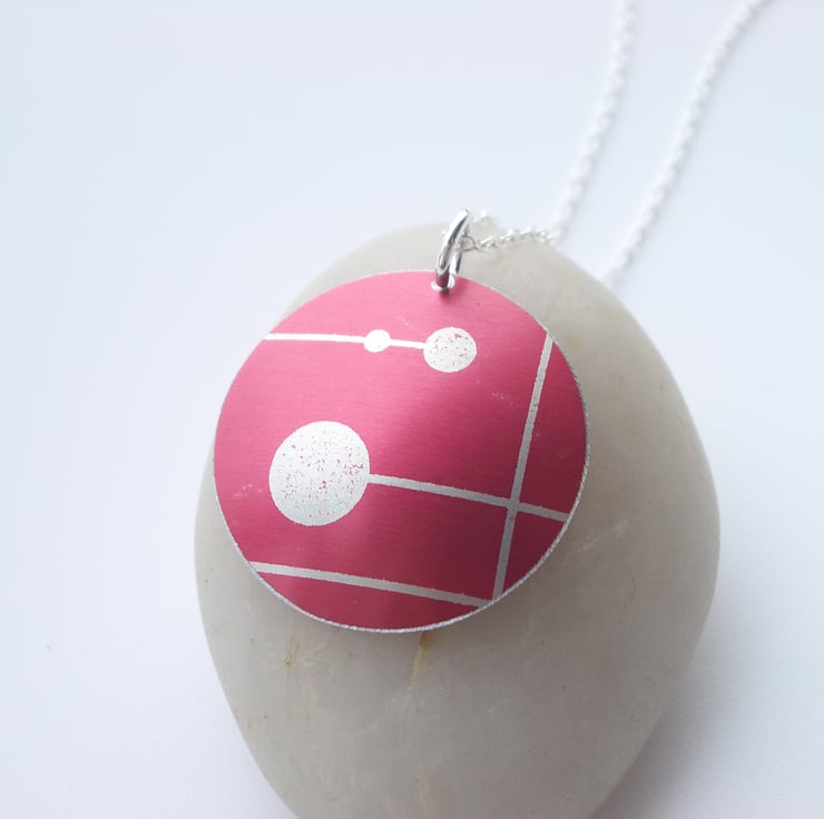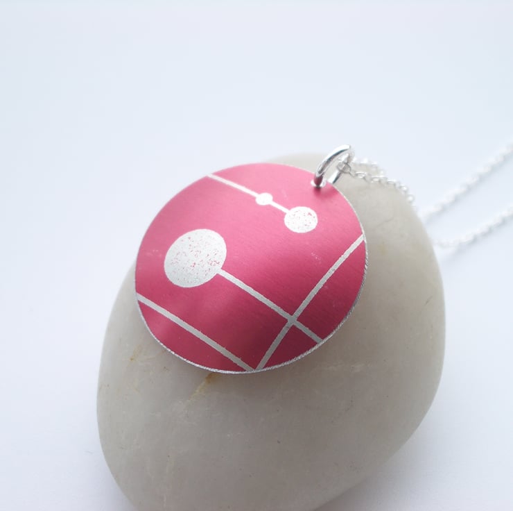 This pendant is made from anodised aluminium which I have dyed red and printed with a mid century design. I hand cut the circle and have domed it so that it catches the light and finally filed the edges to give a smooth finish. The pendant has a 16” sterling silver chain.