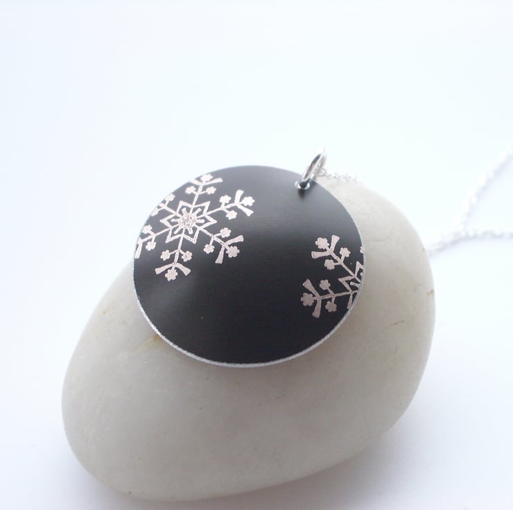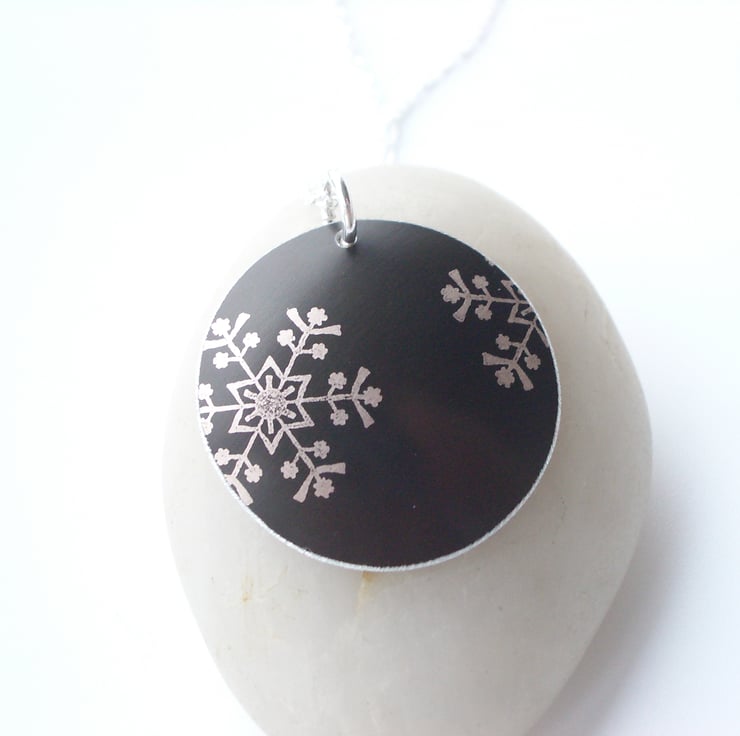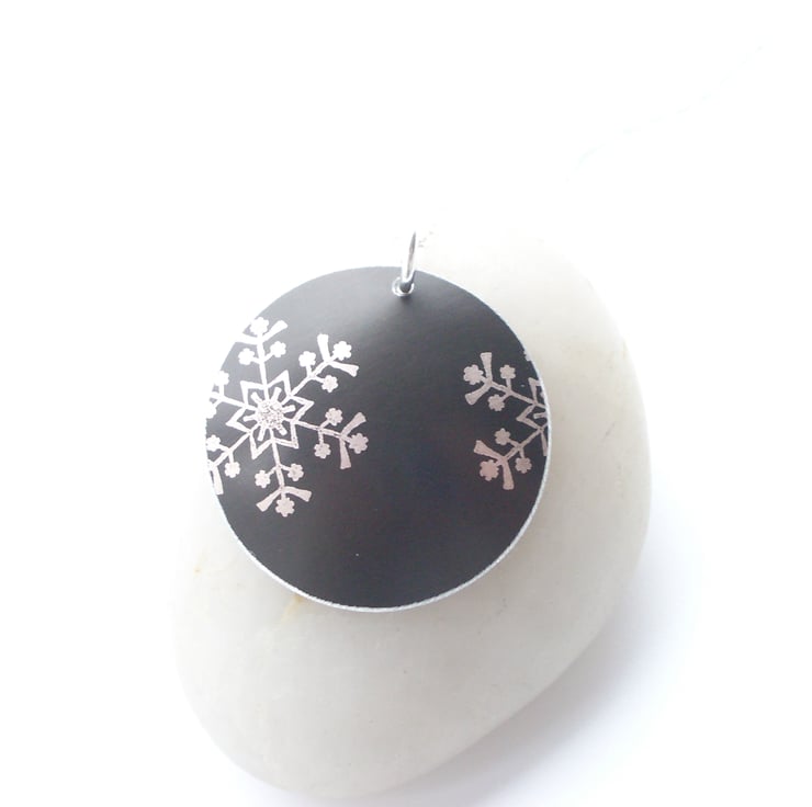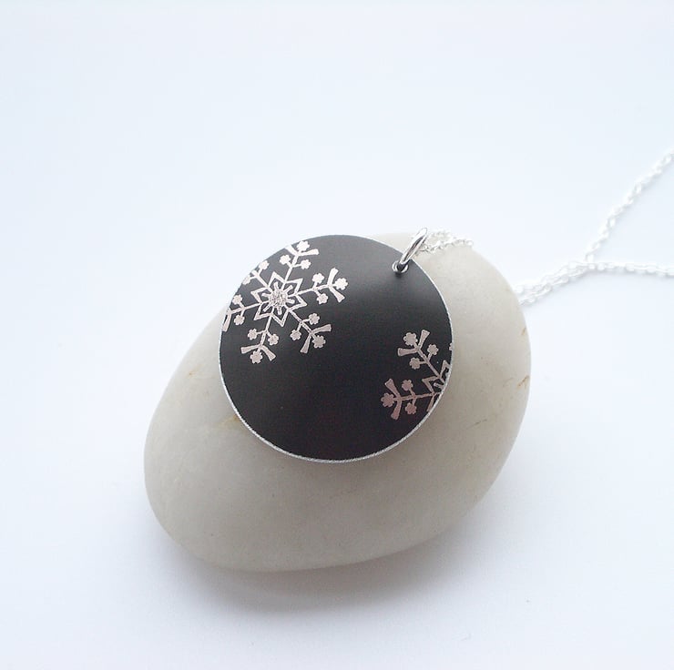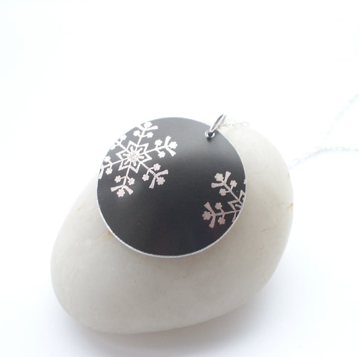 This pendant is made from anodised aluminium which I have dyed black and printed with a snowflake design. I hand cut the circle and have domed it so that it catches the light and finally filed the edges to give a smooth finish. The pendant has a 16” sterling silver chain.