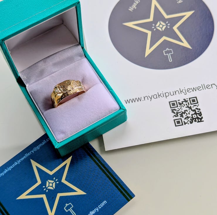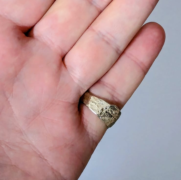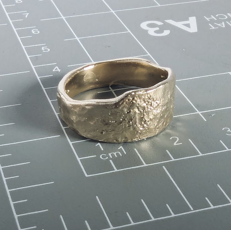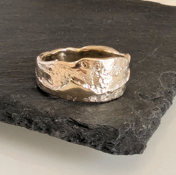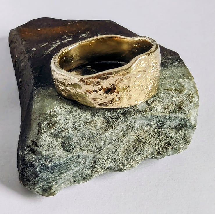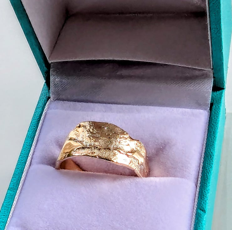 A reticulated textured handmade gold band is a unique and artisanal piece of jewellery. Crafted using intense heat from the jewellers torch, which involves controlled heating and cooling of the metal to create a distinct, organic texture on the surface. This results a one-of-a-kind ring with irregular patterns and handcrafted feel. The use of gold adds a luxurious touch to the piece, making it a beautiful and valuable accessory. It can be worn as a wedding band, engagement ring or simply as statement piece of jewellery. Made in different widths to suit indiviual tastes and preferences.