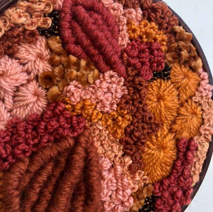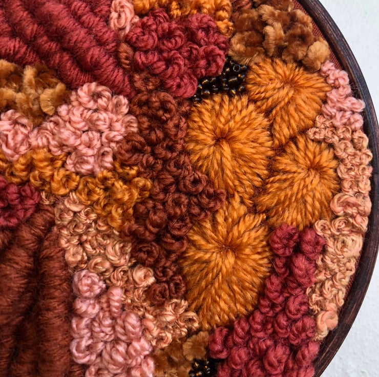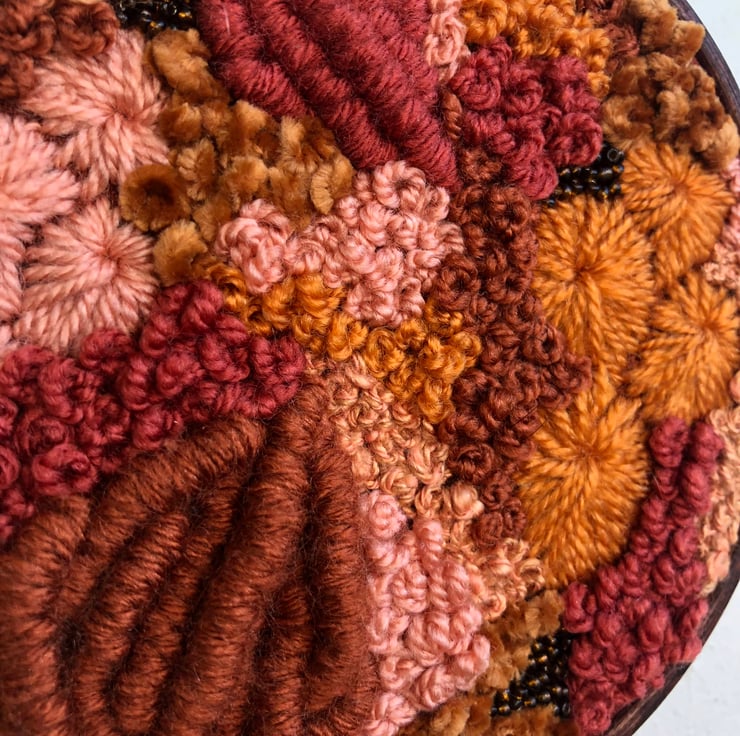 Autumn calls a 5 inch one of a kind art piece. Embroidery thread, yarn and beads have been hand stitched onto a burnt orange fabric in an abstract pattern the piece has then been placed in a hand stained dark wood hoop. This has created a art piece which is both eye catching and unique a perfect addition to any home