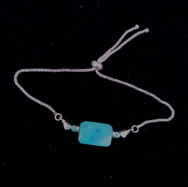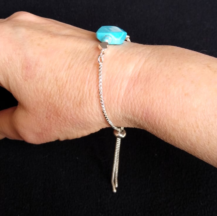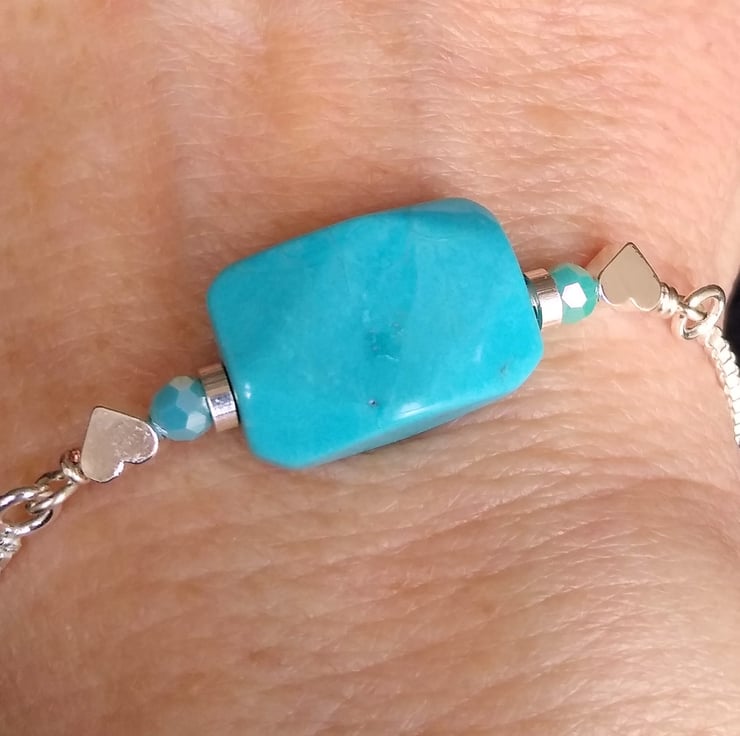 An easy to wear silver plated slider bracelet, adjustable to fit most wrist sizes. With a featured large turquoise blue coloured Magnesite faceted rectangle, centered between two silver plated heart beads and crystal blue beads.