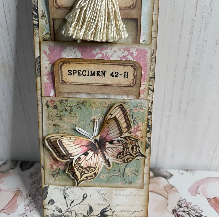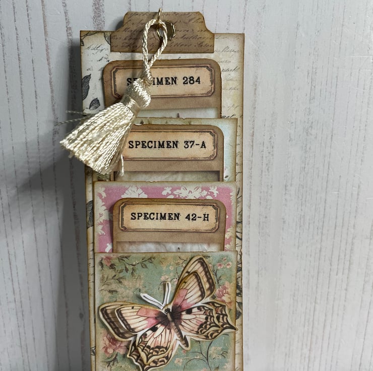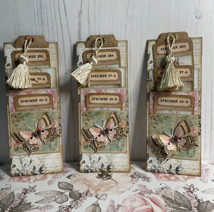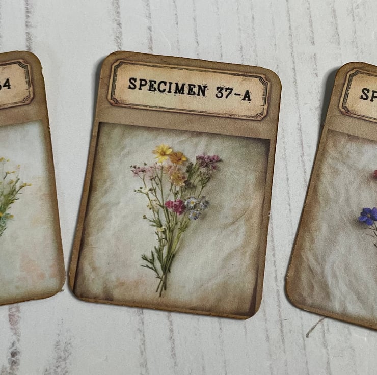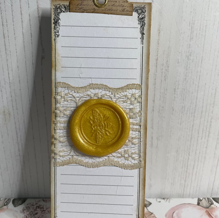 Set of 3 pocket tags to add to a journal. Each tag has 3 pockets in pretty designs. 3 herb specimen tags. Too tab has a gold eyelet with a cream tassel. Back of card is lined with coffee stained lace and a bee wax seal in gold.