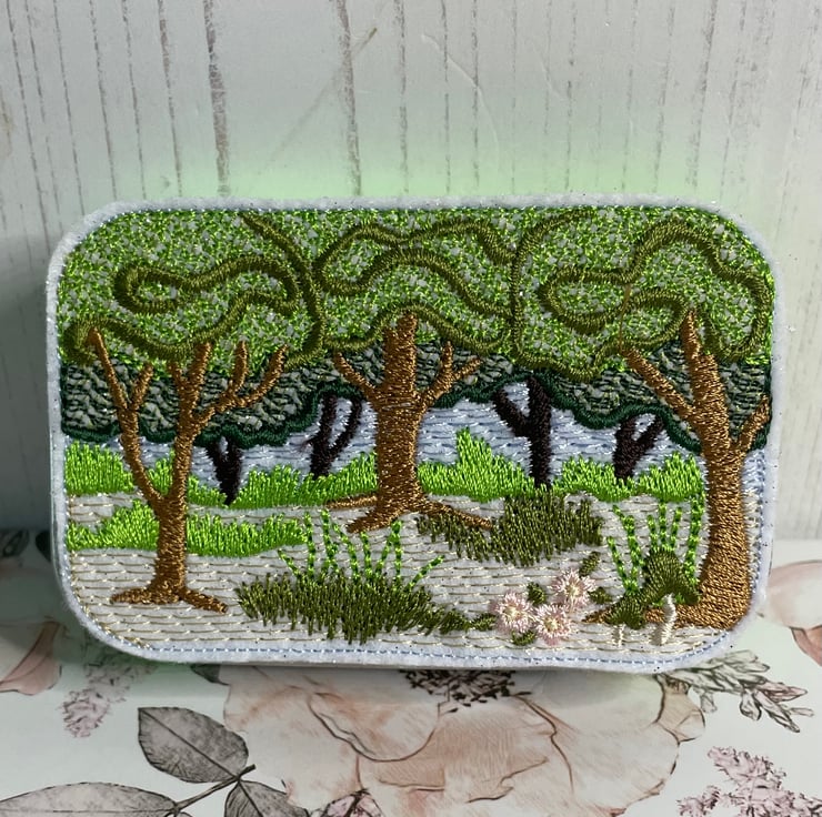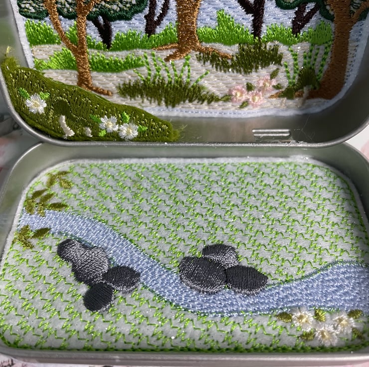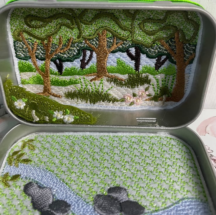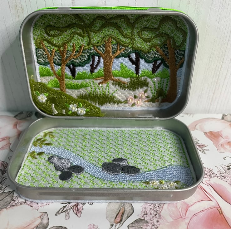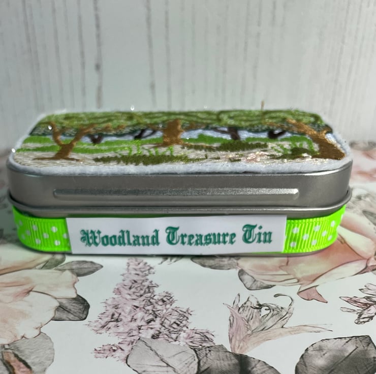 Treasure tin with machine embroidered scene in the lid, polka dot ribbon and treasure tin wording on the outside. Opens to reveal a pretty scene in the base with an embroidered section to give a 3D effect. Lid has a continuing scene. This is a special little tin measuring 3.75” x 2.5” x 1”. Use to store precious keepsakes or add some mini figurines as a gift.