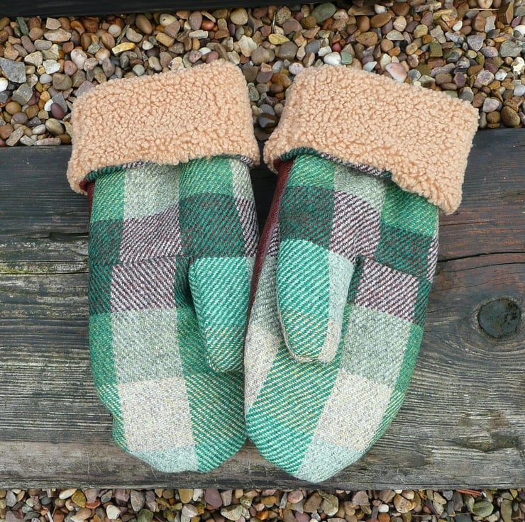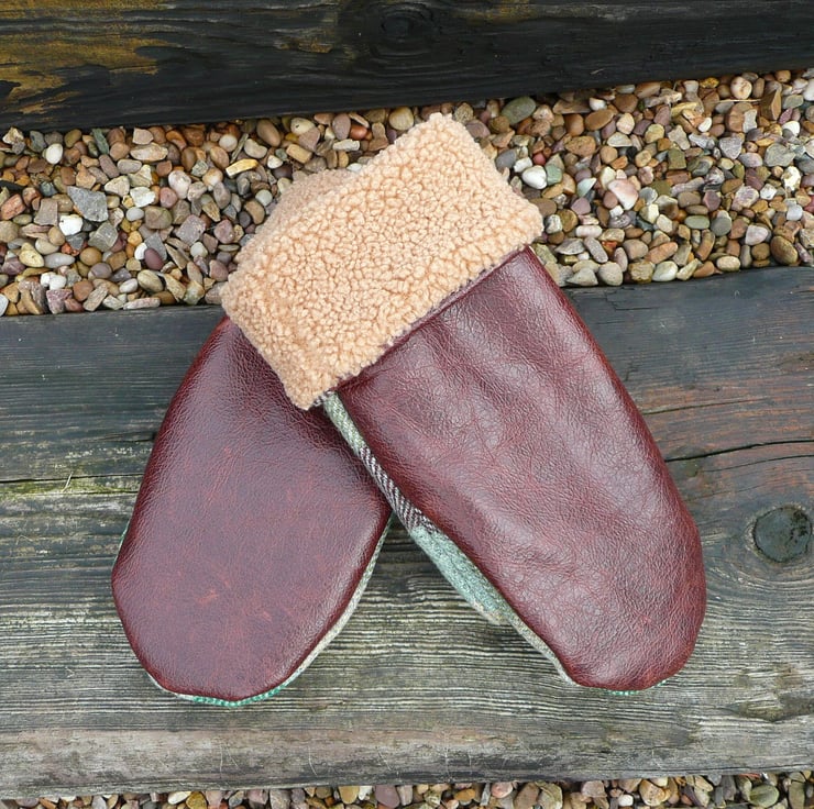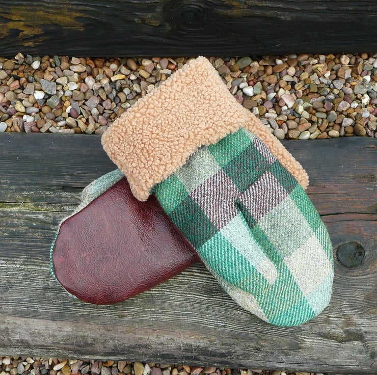 What better way to use up my bag making offcuts than to make cosy mittens for winter, these are made from British wool tweed, soft reddish brown leather and cozy teddy fleece, keeping your hands toasty all winter long.
