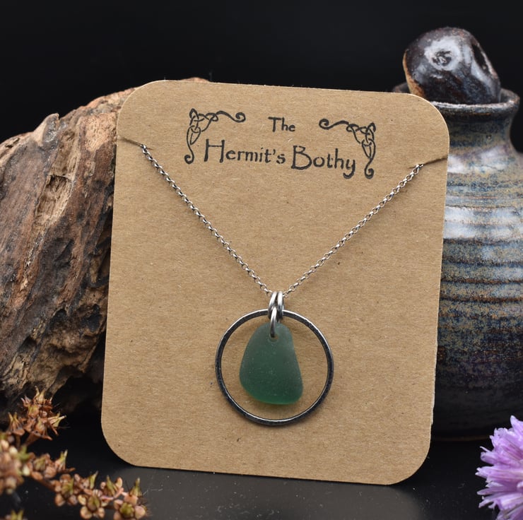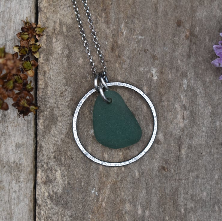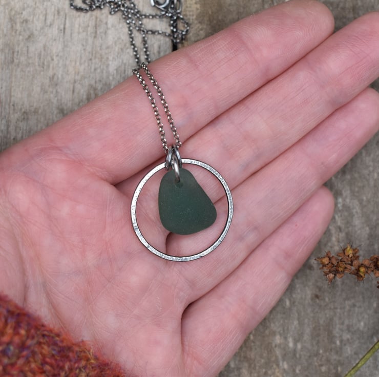 This necklace has been made using recycled sterling silver, and sea glass collected locally in the Scottish Highlands. It features a lovely piece of dark teal sea glass suspended in a handmade sterling silver 925 hoop, which has been hammered for texture. All the sterling silver components have been oxidised using liver of sulphur to give an antiqued finish. The pendant comes with a sterling silver belcher chain with a bolt ring clasp, in a length of either 45cm (18 inches) or 50cm (20 inches) - please specify when ordering which chain length you would prefer (please refer to length reference photo).