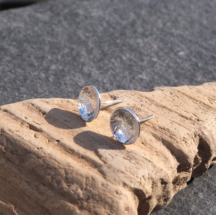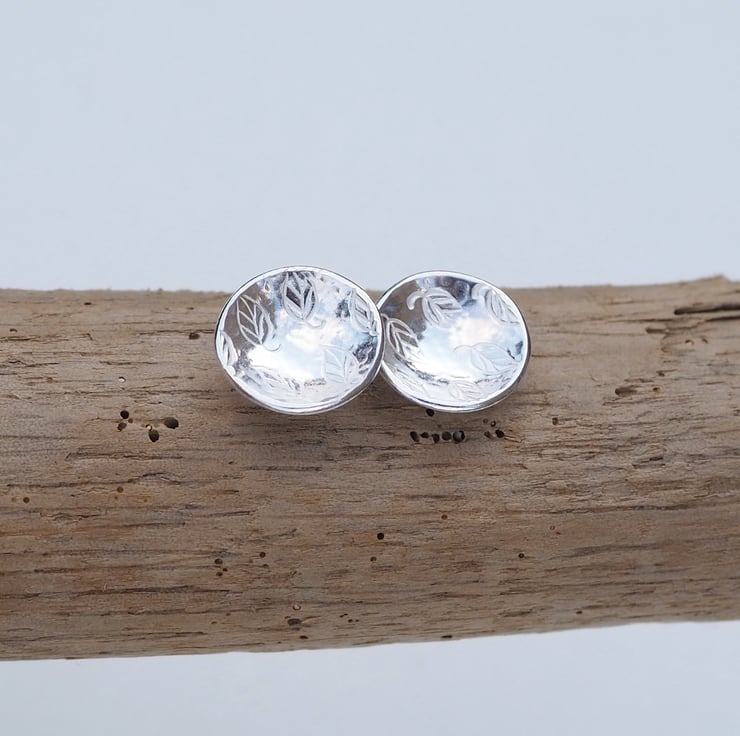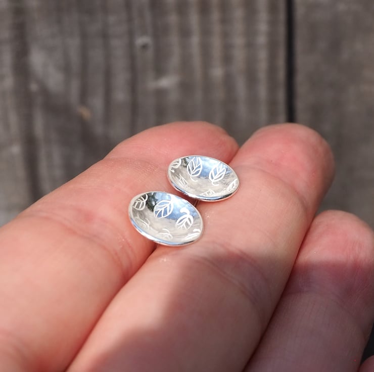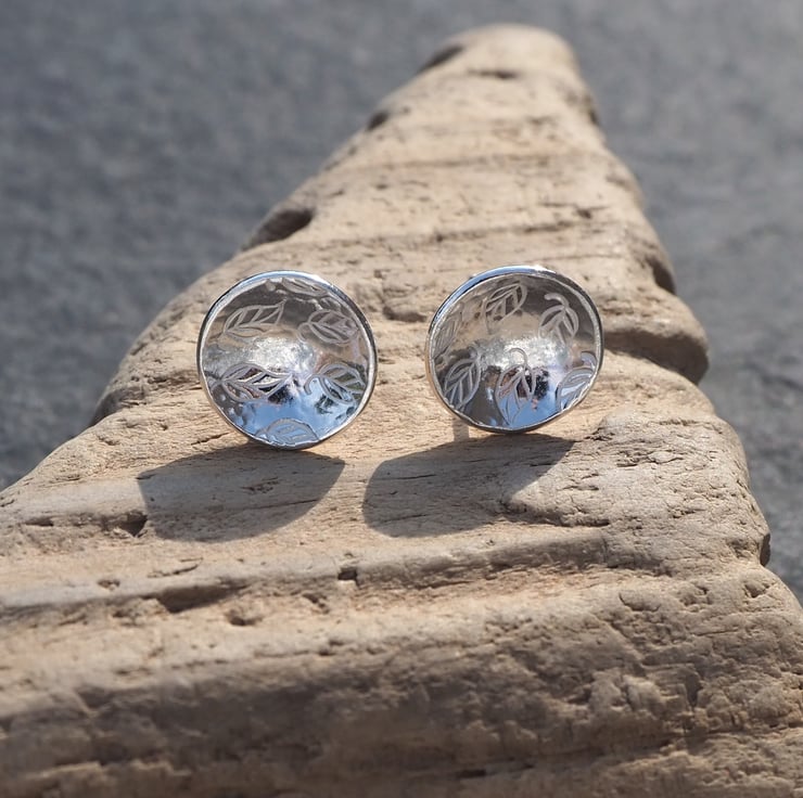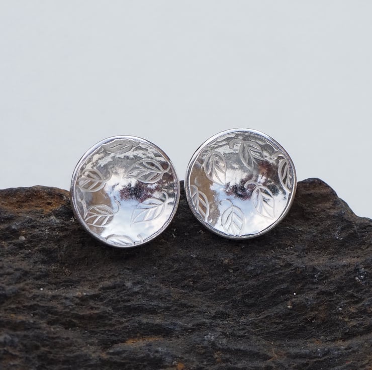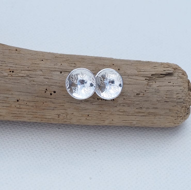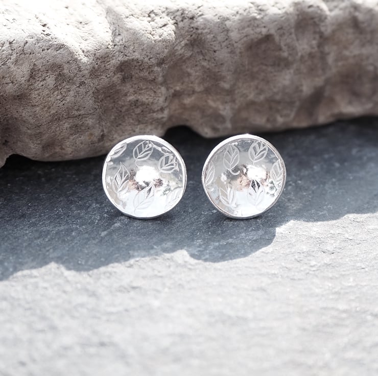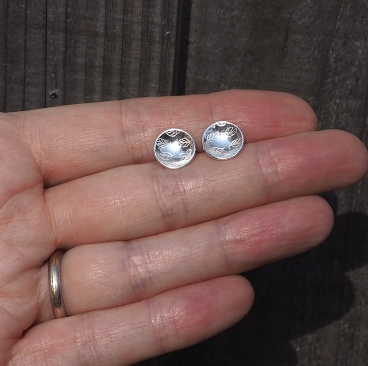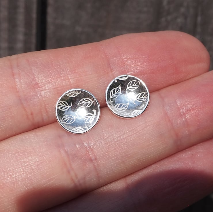 Handmade round silver stud earrings with a leaf design punched into the silver.