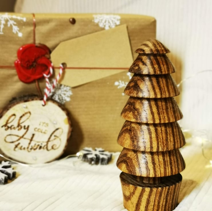 Here we have an 11cm tall had turned Christmas tree decoration made from striking Zebrano wood and finished with a local beeswax polish to really highlight the grain.