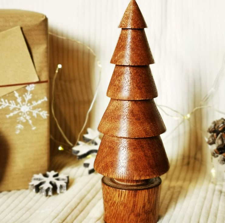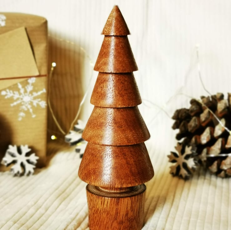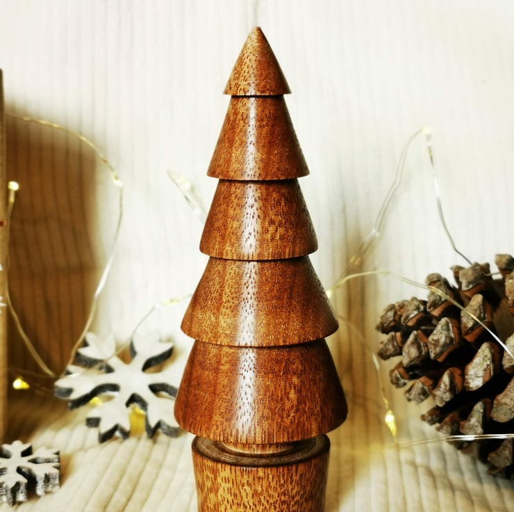 A 13cm tall hand turned Christmas tree from Gombe wood, finished in locally sourced beeswax to give a warm sheen to the grain