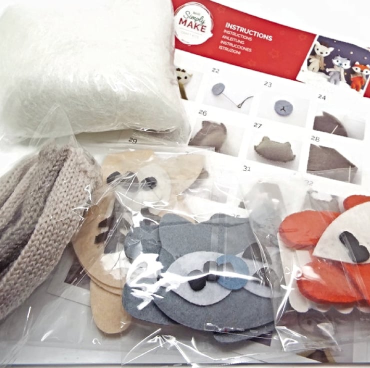 Kit Contents: Polyester Filling, Pre-Cut Felt Shapes, Thread, Woolen Scarves & Instructions