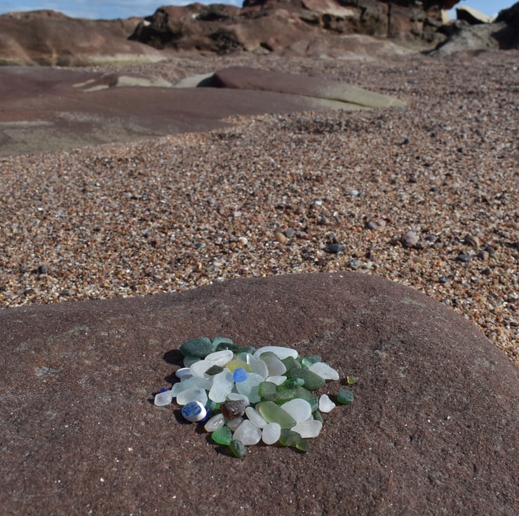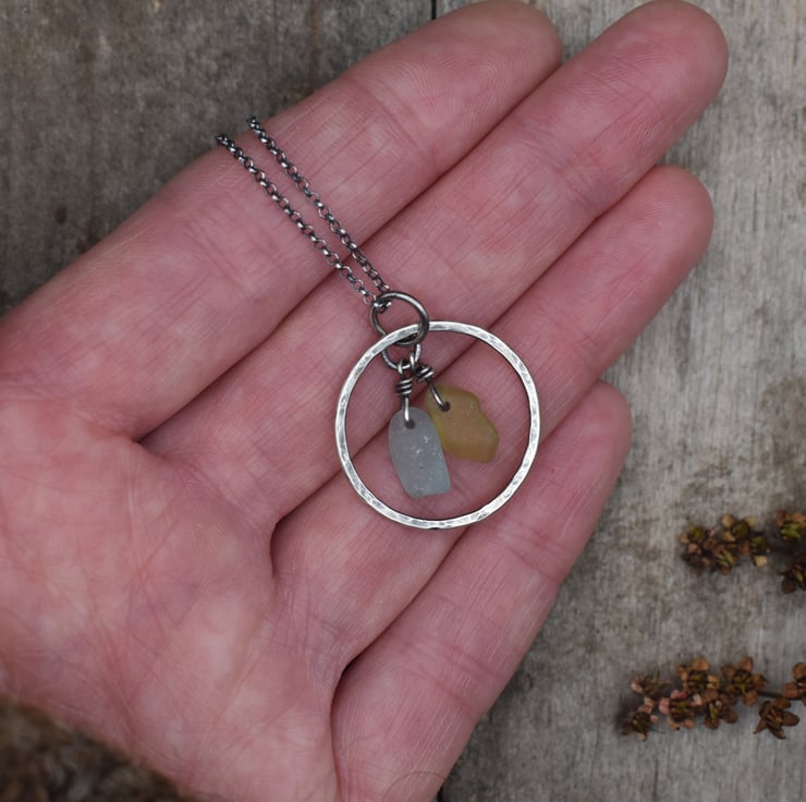 This necklace has been made using recycled sterling silver, and sea glass collected locally in the Scottish Highlands. It features two tiny pieces of sea glass in yellow and seafoam (very pale blue) suspended in a handmade sterling silver 925 hoop, which has been hammered for texture. All the sterling silver components have been oxidised using liver of sulphur to give an antiqued finish. The pendant comes with a sterling silver belcher chain with a bolt ring clasp, in a length of either 45cm (18 inches) or 50cm (20 inches) - please specify when ordering which chain length you would prefer (please refer to length reference photo).