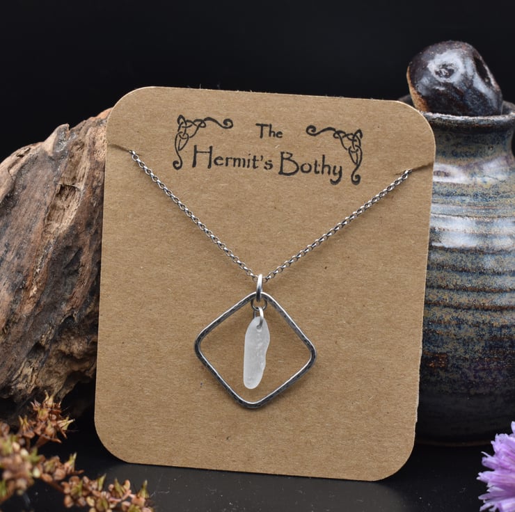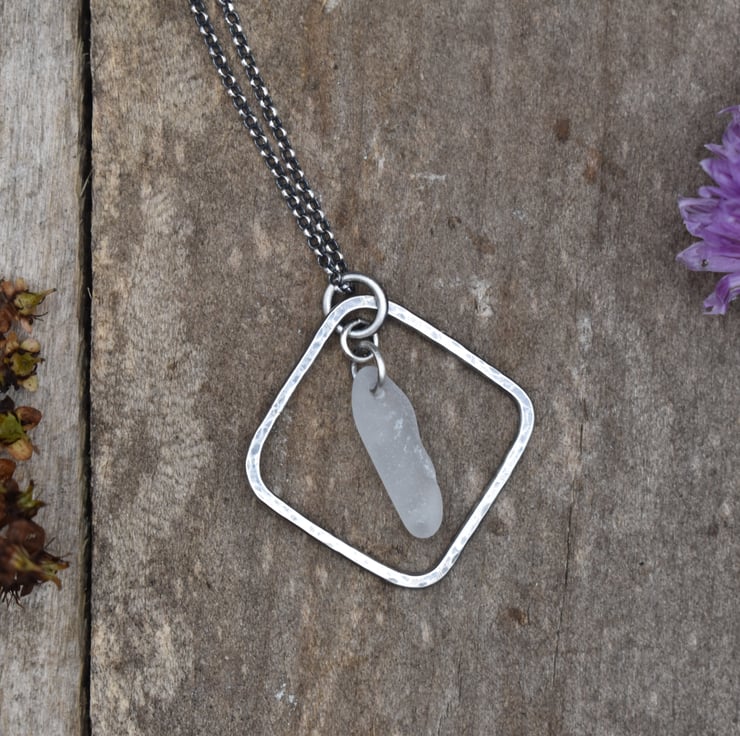 This necklace has been made using recycled sterling silver, and sea glass collected locally in the Scottish Highlands. It features a long piece of frosted white sea glass suspended in a handmade sterling silver 925 square shape, which has been hammered for texture. All the sterling silver components have been oxidised using liver of sulphur to give an antiqued finish. The pendant comes with a sterling silver belcher chain with a bolt ring clasp, in a length of either 45cm (18 inches) or 50cm (20 inches) - please specify when ordering which chain length you would prefer (please refer to length reference photo).