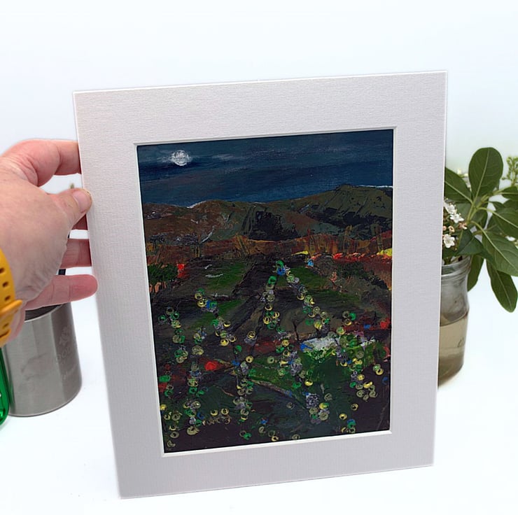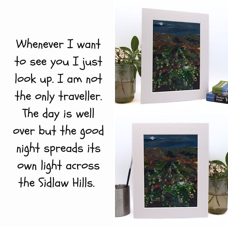 (66) This original painting is called, 'The Good Night Spreads It's Own Light Across The Sidlaw Hills'. The best way to let go of the stresses and strains of the day is to get out into the hills. Sometimes a drive at night in the countryside can be so relaxing. This is a mounted, acrylic painting and would make an ideal gift for any art lover on any occasion.