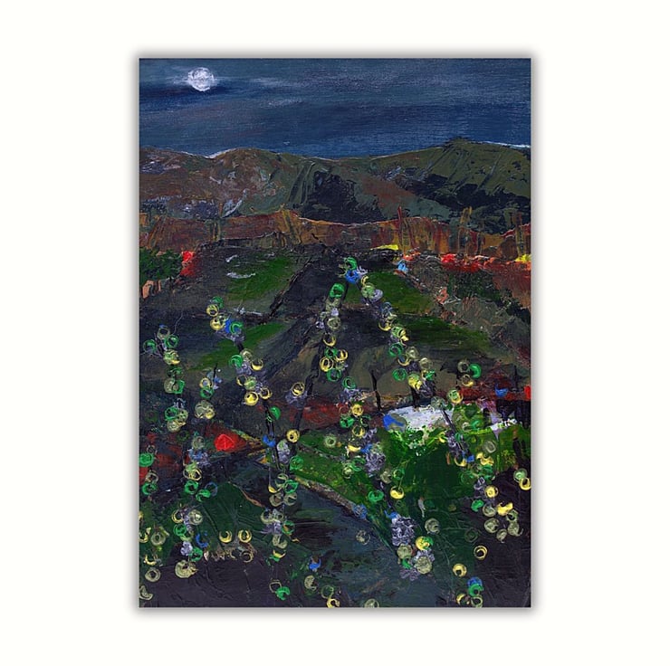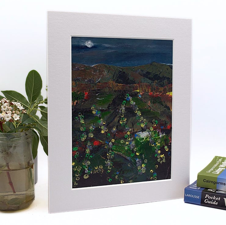 This is a Scottish landscape painting. It is a painting of the Sidlaw Hills at night with the moon shining bright. The Sidlaws are a collection of hills that span Perthshire and Angus in Scotland. I wanted to capture the beautiful veil of moonlight that covers the hills, fields and trees. I have used professional quality acrylic paints. I have also used a range of knives, brushes and twigs to apply layers of paint across the paper.