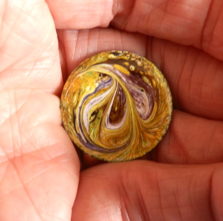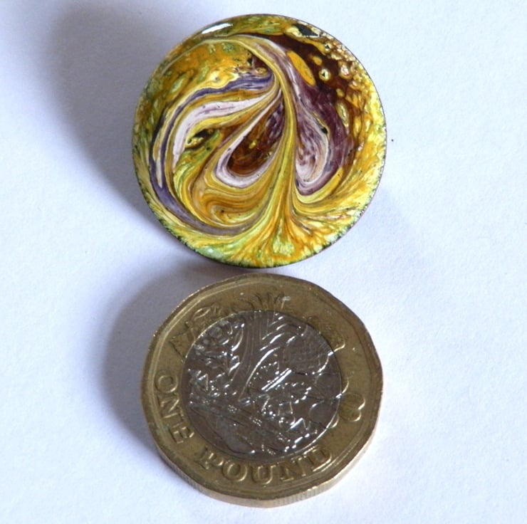 To make this brooch I have scattered the powdered enamel colours over a white enamel background and then drawn through the surface while the brooch was red hot in the kiln. I have limited control over the way the enamel will be drawn out by the steel point, resulting in the unique, random pattern. The brooch has a tactile element too, in that the enamel has not set flat after being disturbed and consequently there are dimples and runs in the surface that affect the way in which light is reflected from it.