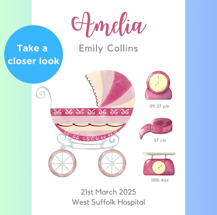 I was inspired by images of vintage prams I saw on Pinterest and incorporated elements of some of the designs I saw, such as the ornate metalwork, to create this stylized image of a pram. In keeping with the look I was aiming for, I created the old-school clock, tape measure and scales icons. I felt it was important to offer the design in a range of colourways, with gender-neutral options, in addition to the more traditional pink and blue, to suit a range of tastes and colour schemes