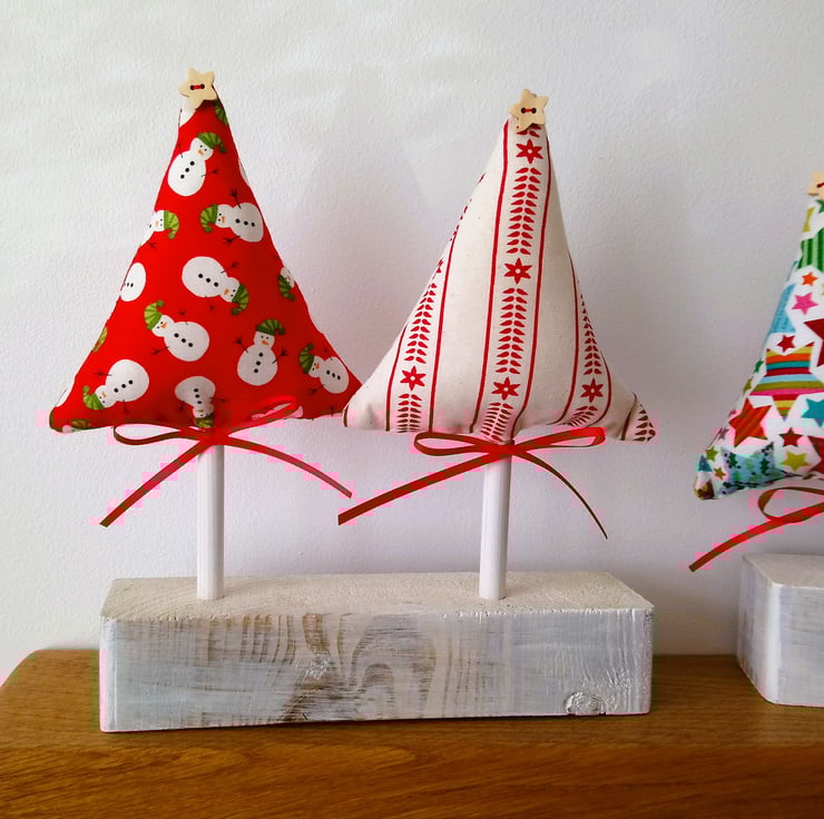 These double tree table decorations have been made from fabric and rustic recycled wood, and come in the following pairing of fabrics: