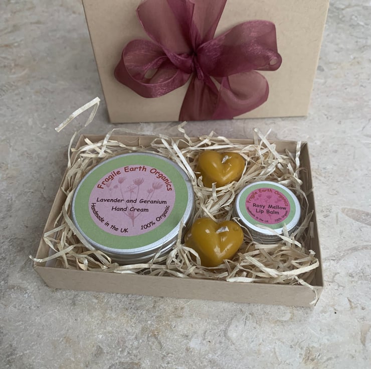 This gift set combines a lavender and geranium hand cream with a gorgeous lip balm and two miniature heart shaped beeswax candles all packed up in a recycled kraft gift box tied with upcycled ribbon.