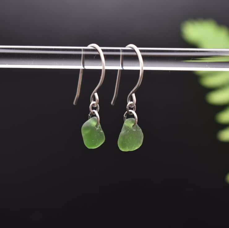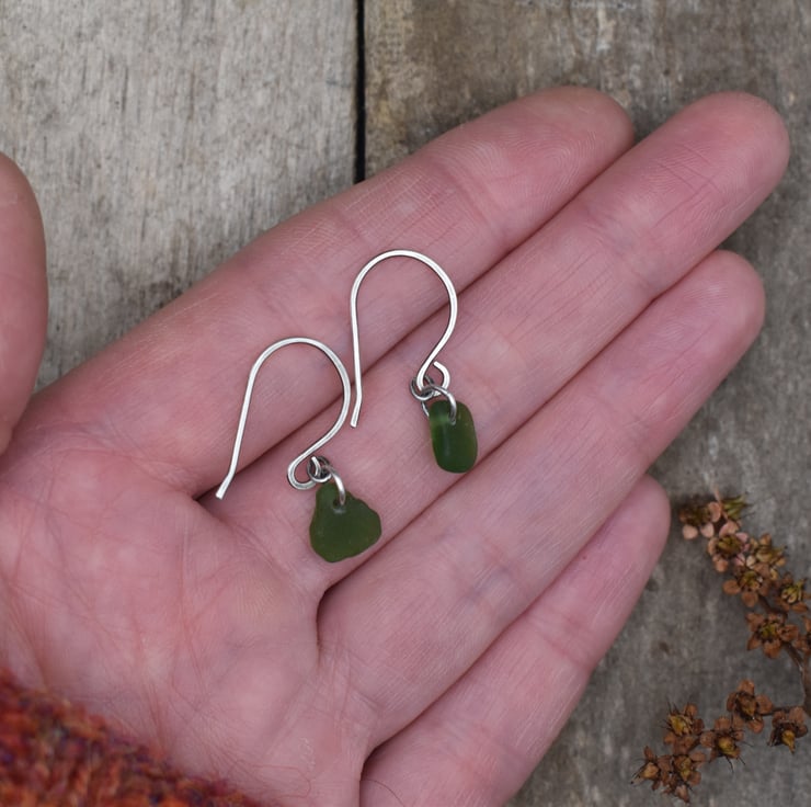 These minimalist little earrings have been made using recycled sterling silver, and sea glass collected from a local Highland beach. Each earring features a small piece of green sea glass, and handmade sterling silver hooks. They measure just less than 3cm from the top of the hook, and have a 'dangle length' (from the bottom of the hook) of approximately 1.4cm. The sterling silver components have been oxidised using liver of sulphur to give an antiqued finish.