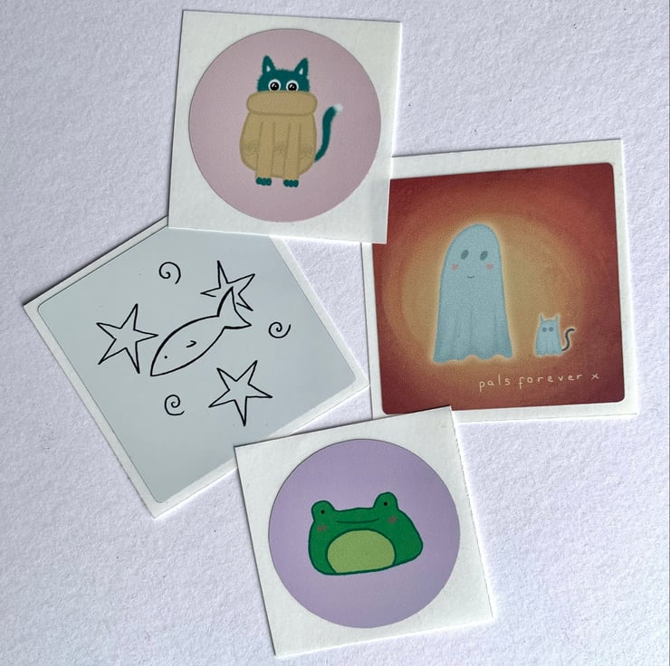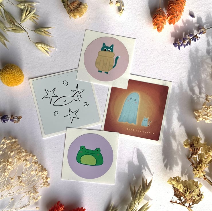 A pack of four stickers, each one a cute friend to keep you company anywhere! All printed on waterproof PVC-free vinyl.