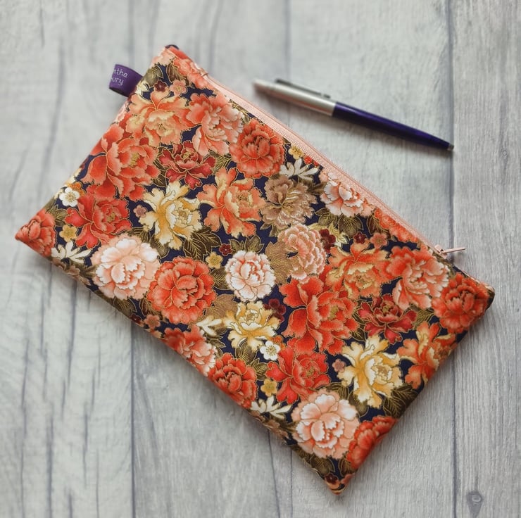 A lovely autumnal zip top storage bag in a Japanese style print of cream, peach and orange paeonies all picked out in metallic gold. Lined with a tone on tone orange swirl print, this simple flat storage bag is lightly padded to protect the contents and could be used for make up, medication, small projects or as a pretty pencil case.