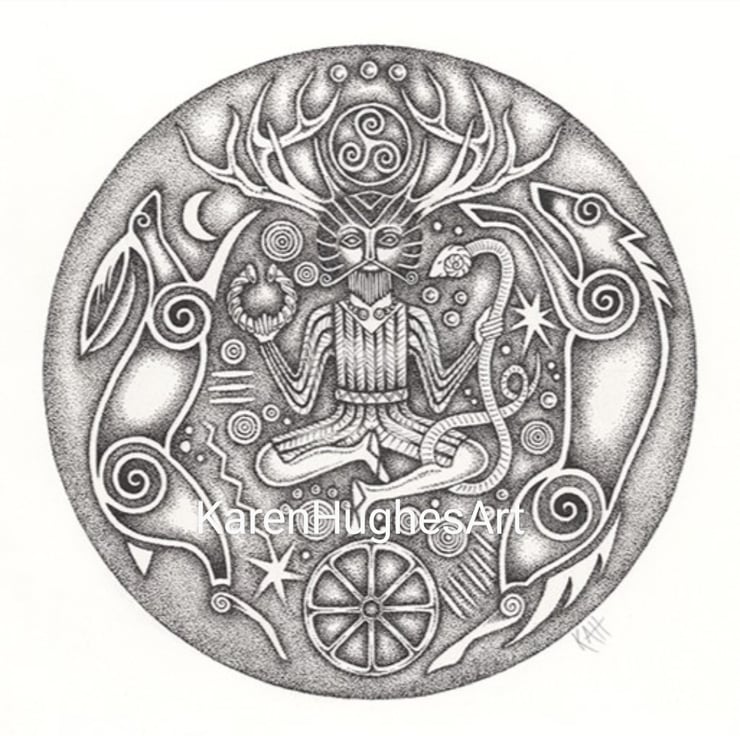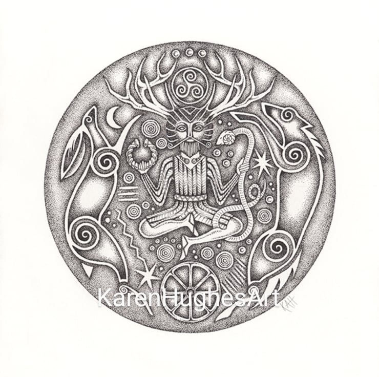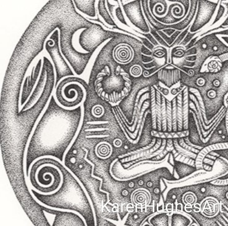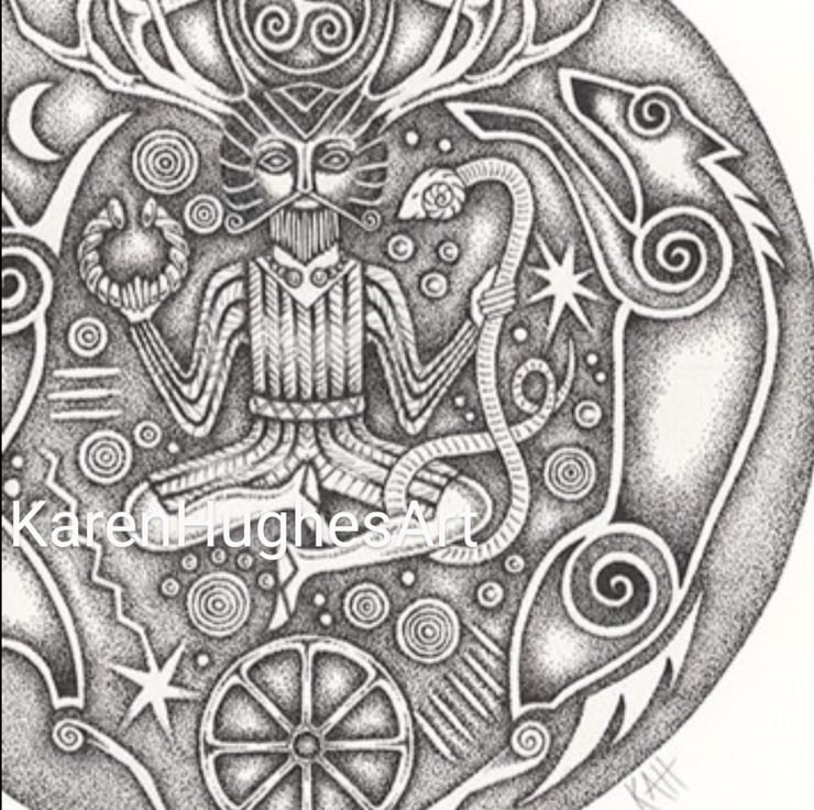 This drawing is loosely based on Celtic coins, and although first appeared as part of my Earth Spirit drawing, I thought it deserved to shine on its own too. The central figure is inspired by a horned god figure on the magnificent Gundestrup cauldron, a highly decorated vessel of silver found in Denmark in 1891, although it is believed to have been made elsewhere. It is over 2000 years old, and I was lucky enough to see it on display in Edinburgh in 2016 as part of the exhibition, The Celts.