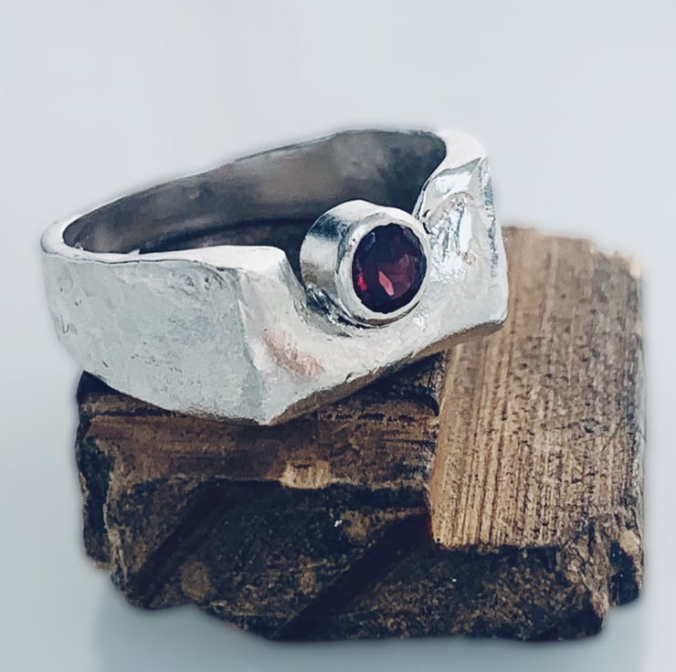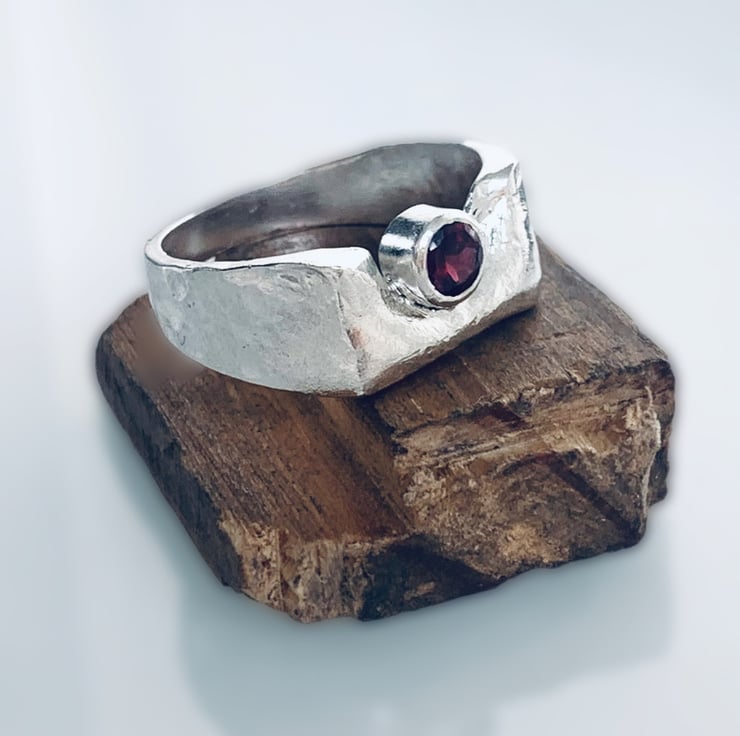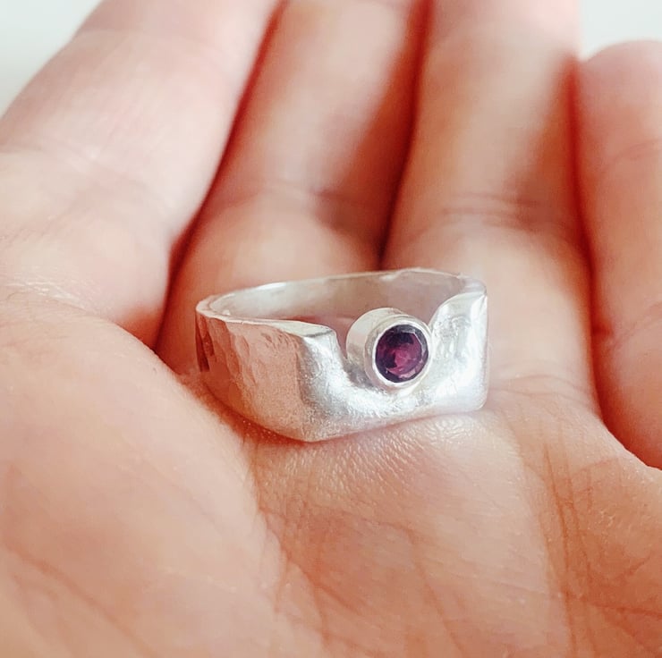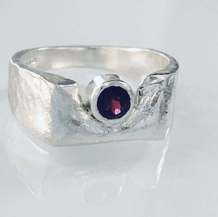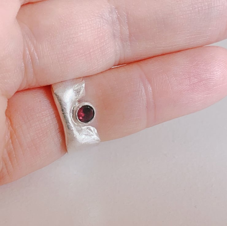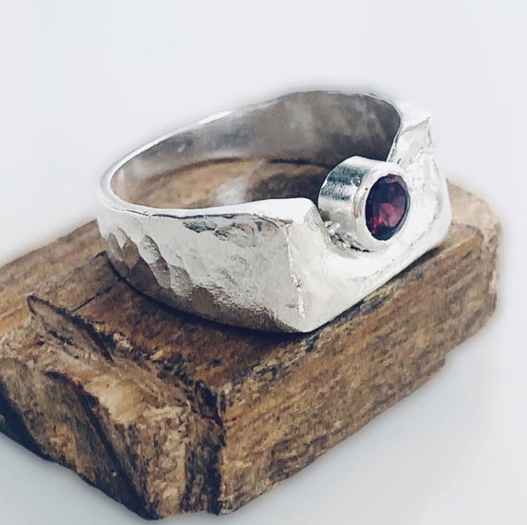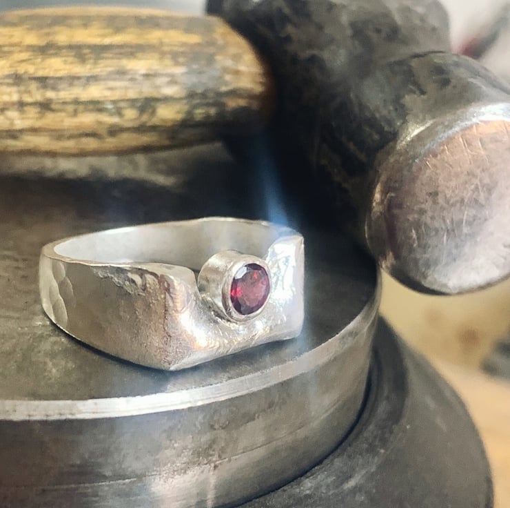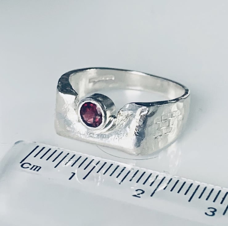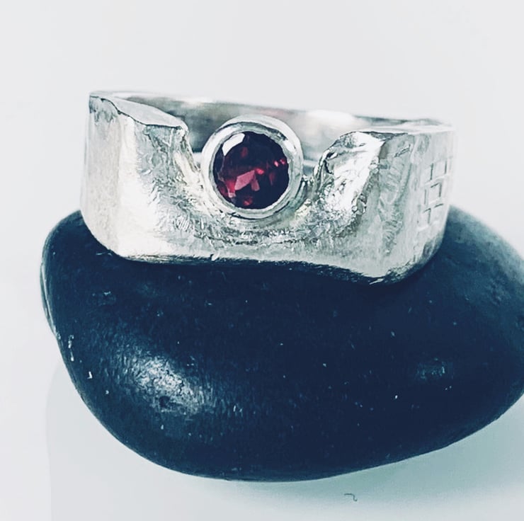 Sterling silver fire textured, hammered & hand stamped with a brick design on shoulder. Embellished with a beautiful deep wine red garnet gemstone in the middle of the arc.
