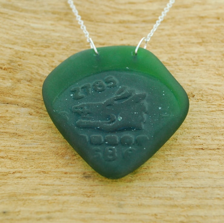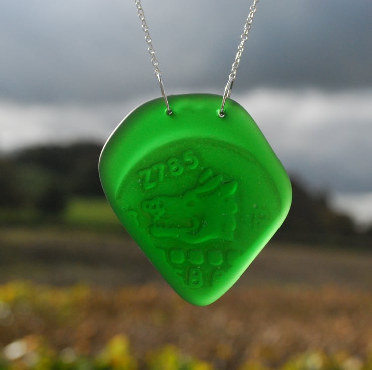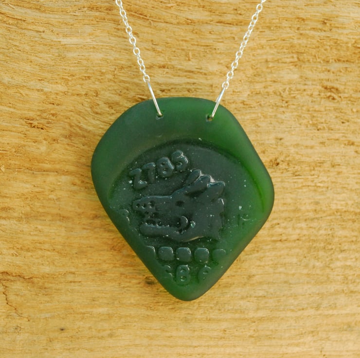 Very occasionally, we find a piece of broken gin bottle with a boar's head on it. This pendant is one of those, and we have tumbled it until it is rounded and smooth. The gin bottle was made by United Glass, and the code on it indicates the type of bottle. Luckily the bottle was very large, so the bottom was thick and stayed intact despite being tossed by the waves. This makes an unusual pendant with historical interest, which can also be used as a sun catcher.