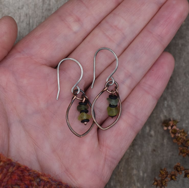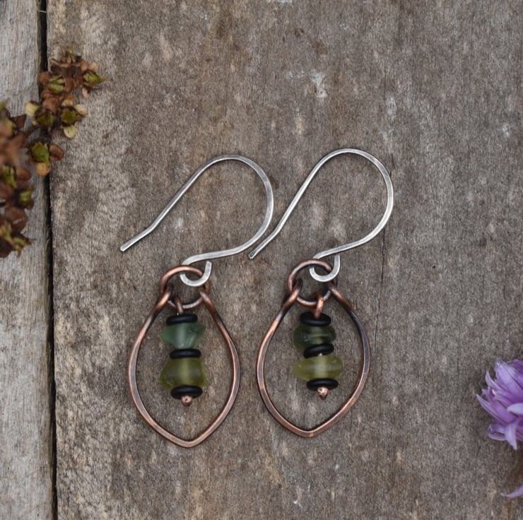 Rustic, boho-style earrings featuring sea glass collected from one of my local Highland beaches. Each earring comprises two tiny pieces of sea glass, separated by matte black Czech glass beads, with handmade copper wirework components and a handmade recycled sterling silver hook. They measure approximately 4cm from the top of the hook, and have a 'dangle length' (from the bottom of the hook) of around 2.5cm.