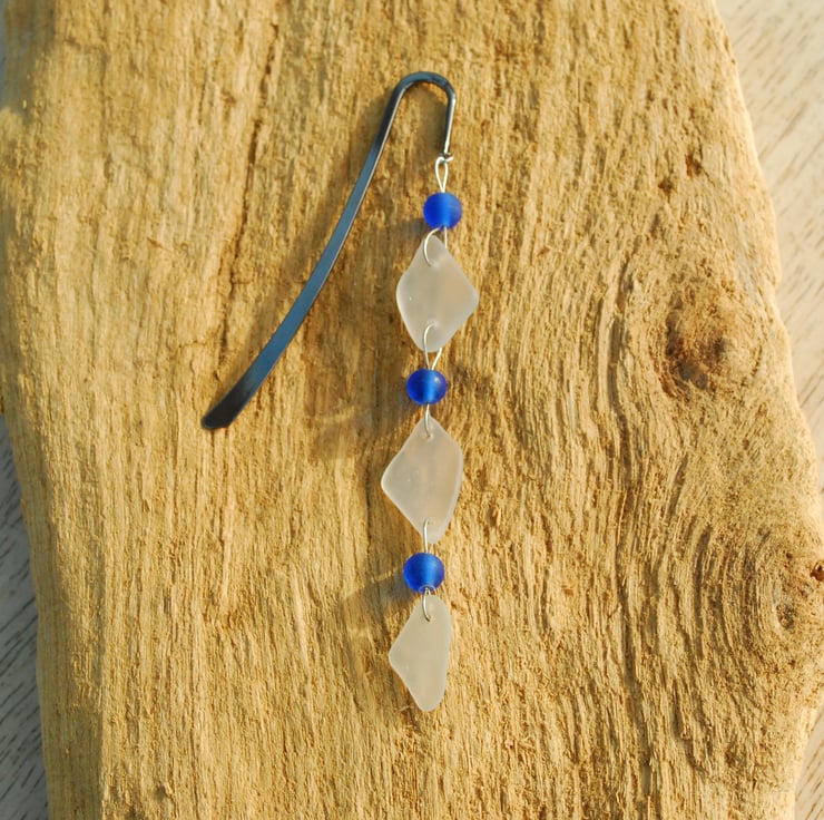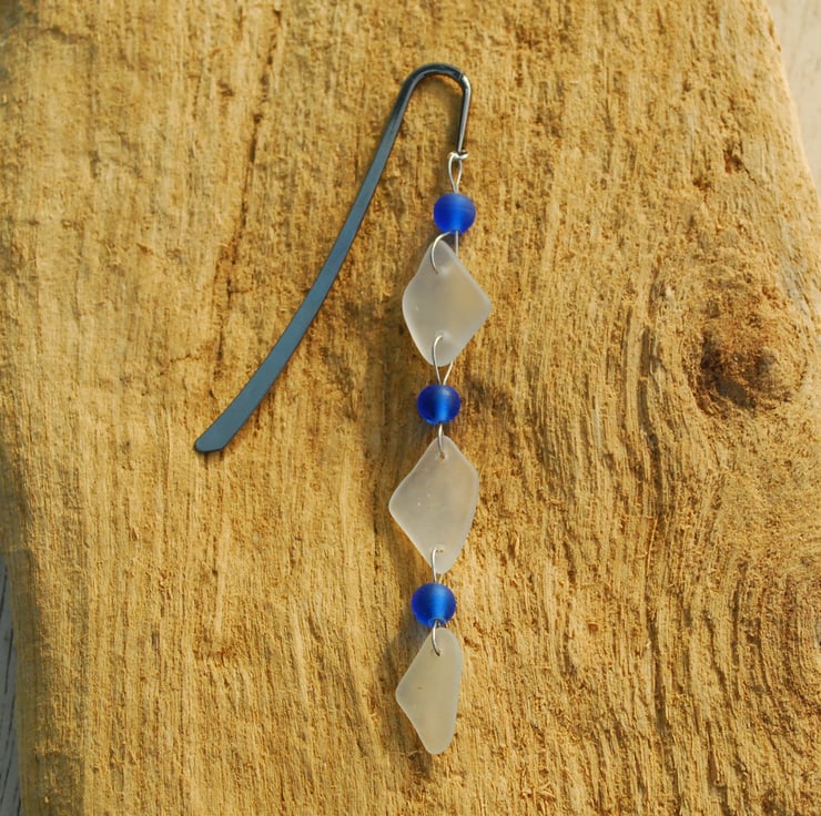 Frosty white tumbled beach glass looks great with dark blue beads in this pretty bookmark. A gun metal coloured hanger, best seen in photo 2, completes this lovely item.